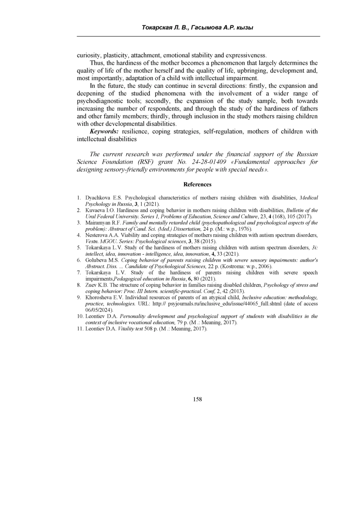 5. Токарская Л.В. Исследование жизнестойкости матерей, воспитывающих детей с расстройствами аутистического спектра // Токарская Л.В., Трубицына А.Н., Бутакова Е.С., Джултаева А.С. // 3i: intellect, idea, innovation - интеллект, идея, инновация. - 2021. - № 4. - С. 33-44. EDN: QLERIQ