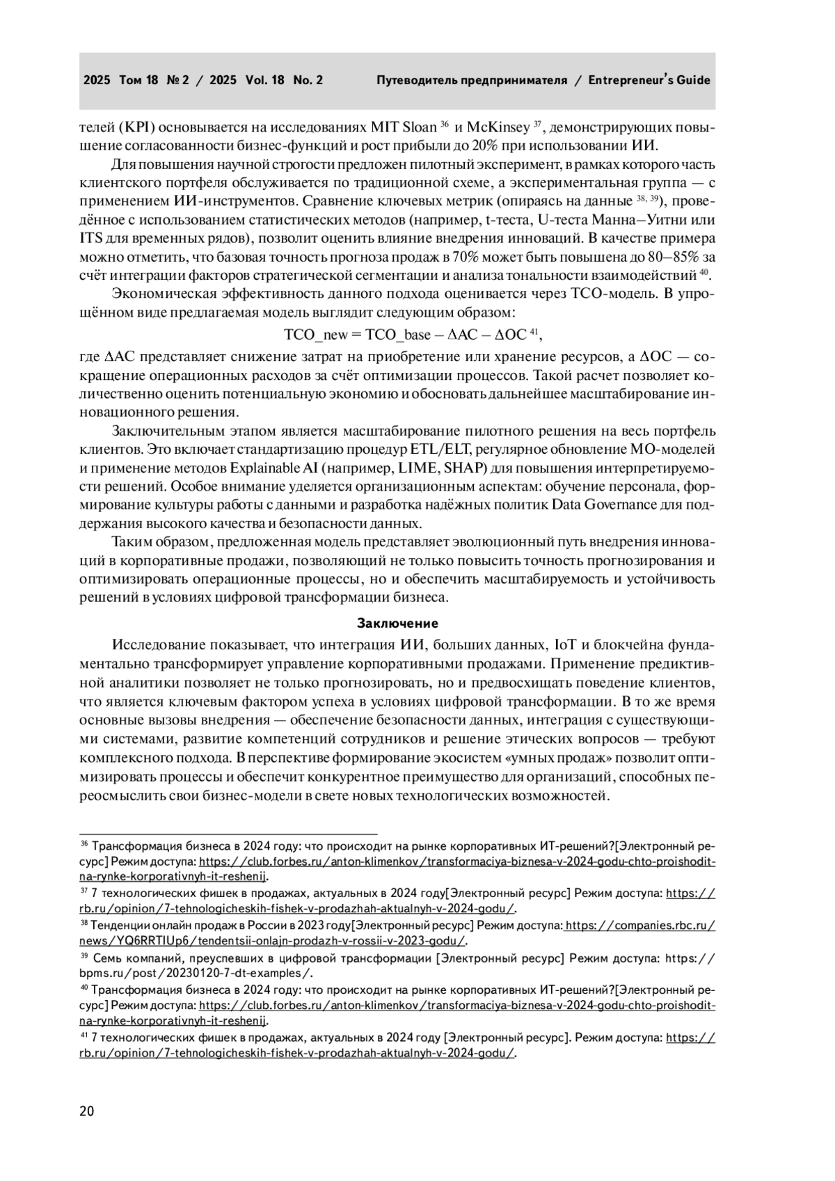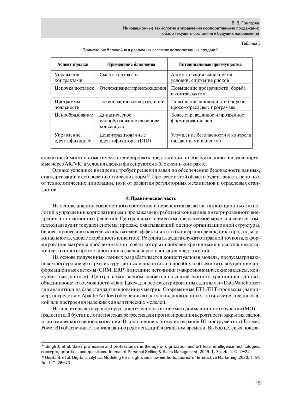 В исследовании анализируются текущее состояние и перспективы развития инновационных технологий в управлении корпоративными продажами. Рассмотрены теоретические основы управления продажами и влияние технологий, таких как искусственный интеллект, аналитика больших данных, блокчейн и IoT. Результаты подтверждают переход к предиктивным, data–driven подходам в продажах благодаря конвергенции этих технологий. Выявлены основные проблемы внедрения, включая вопросы безопасности данных и необходимость адаптации организации. Успешная интеграция этих технологий может обеспечить конкурентные преимущества за счёт улучшения понимания клиентов, оптимизации процессов и создания новых моделей взаимодействия.
