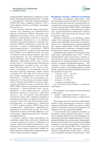 Fateeva AV, Zukov RA. Searching for predictors of the effectiveness of treatment with CDK4/6 inhibitors in patients with HR+/HER2-metastat-ic breast cancer. Onkologiya. Zhurnal im. P.A. Gertsena. 2023;12(3):34-41. (in Russ.).