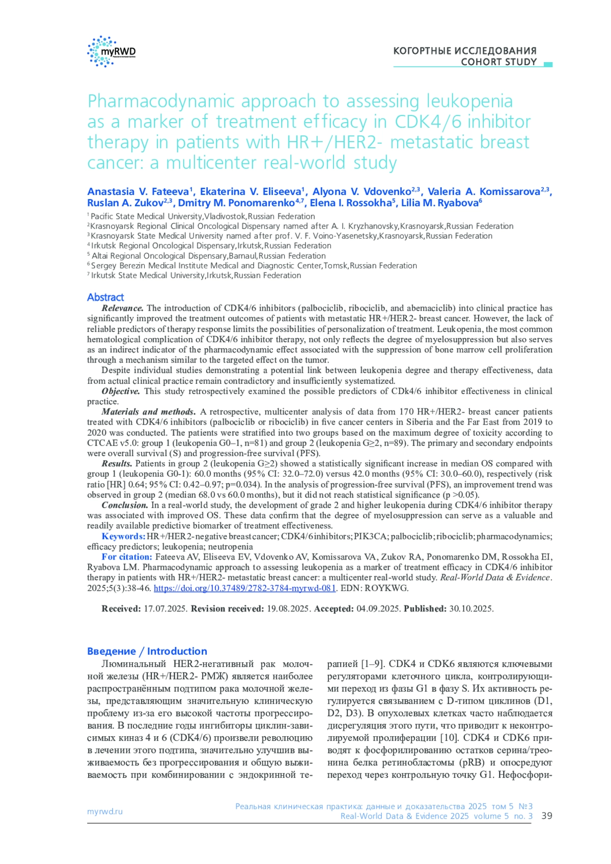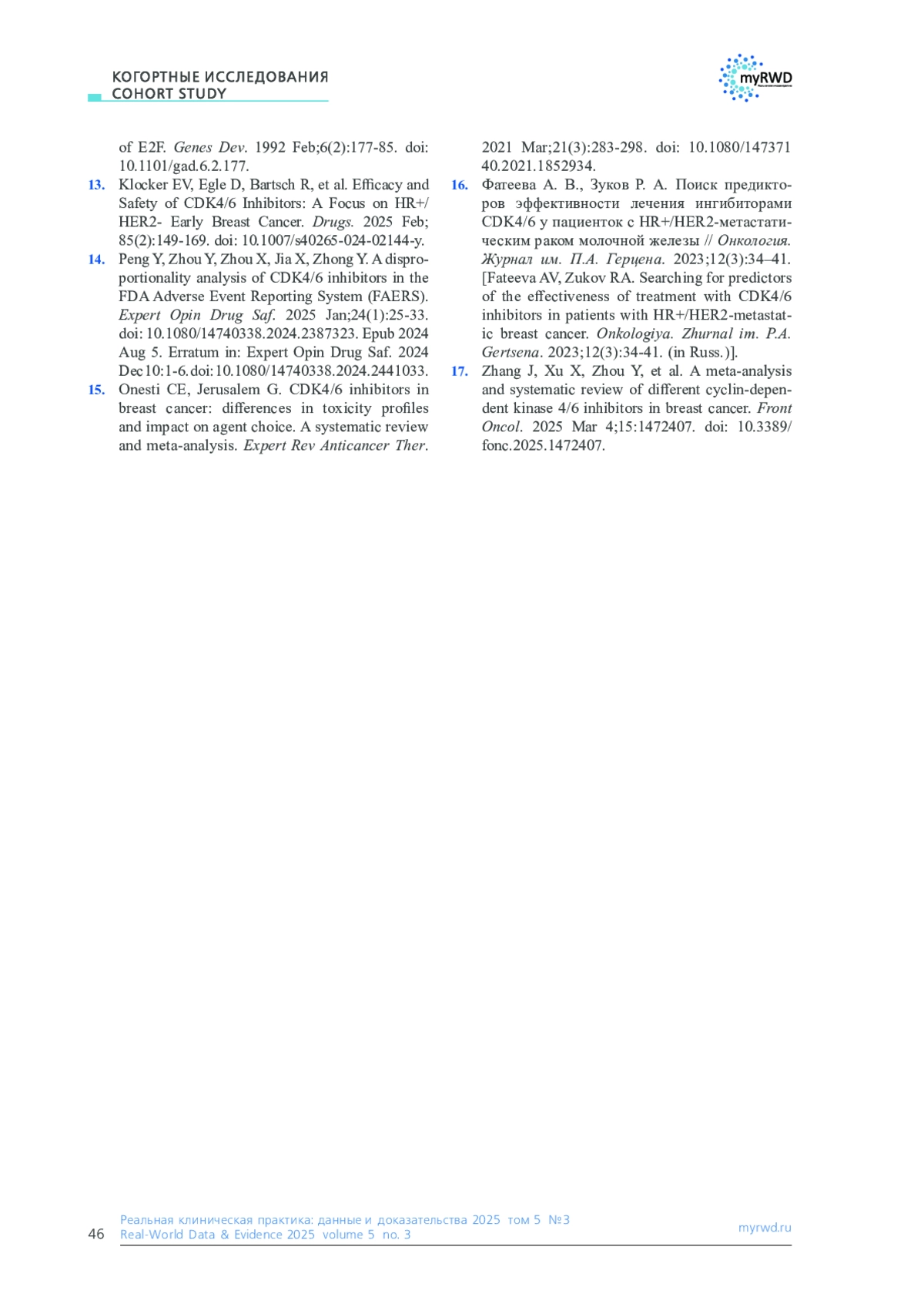 16. Фатеева А. В., Зуков Р. А. Поиск предикторов эффективности лечения ингибиторами CDK4/6 у пациенток с HR+/HER2-метастатическим раком молочной железы // Онкология. Журнал им. П.А. Герцена. 2023;12(3):34-41. EDN: MYFLRU