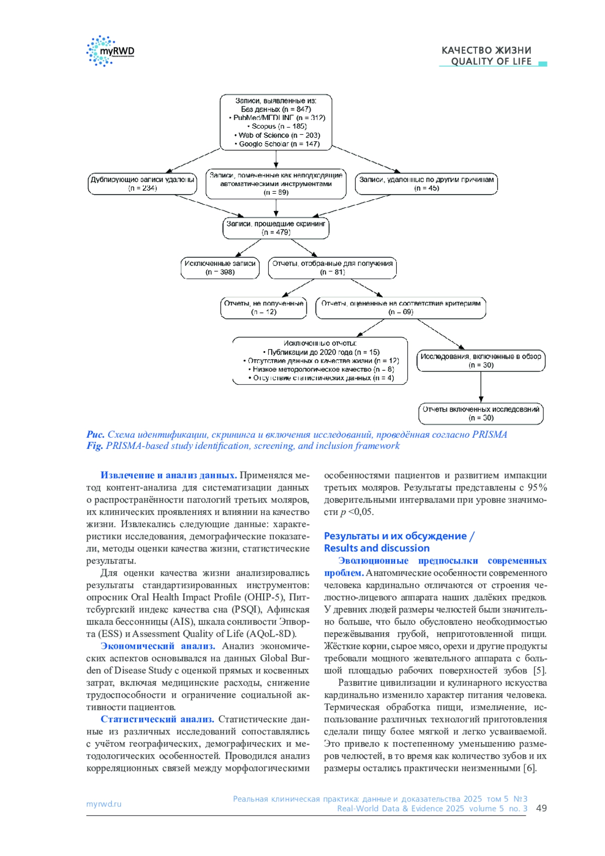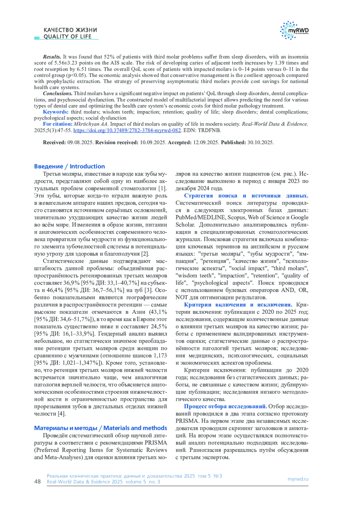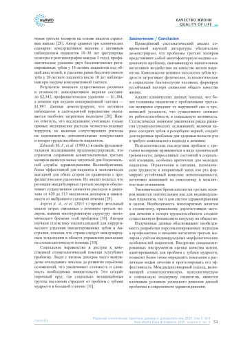 Цель. Провести систематический анализ современных данных о влиянии третьих моляров на различные аспекты качества жизни пациентов с оценкой медицинских, психологических, социальных и экономических факторов воздействия.