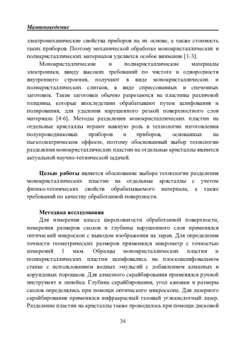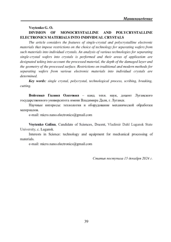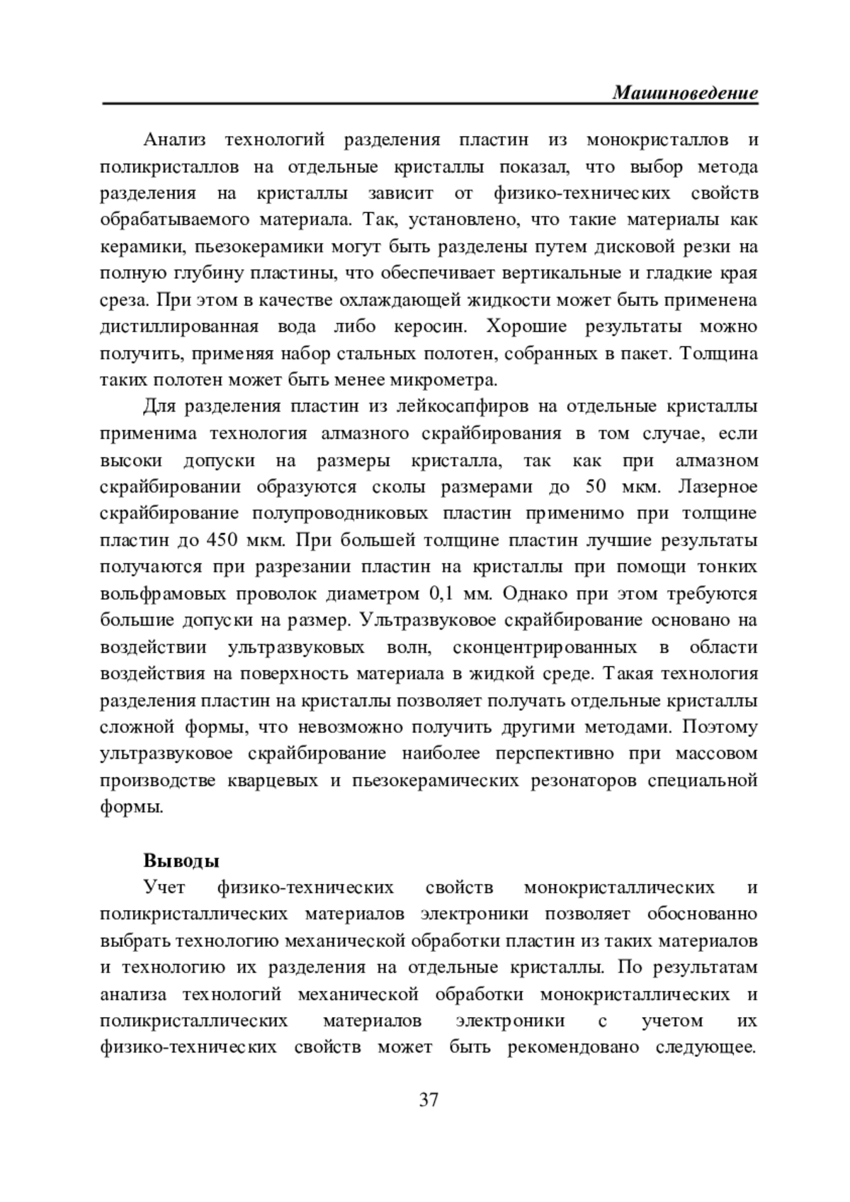 Рассмотрены особенности монокристаллических и поликристаллических материалов электроники, накладывающие ограничения на выбор технологии разделения пластин из таких материалов на отдельные кристаллы. Выполнен анализ различных технологий разделения монокристаллических пластин на кристаллы и обозначены области их применения с учетом обрабатываемого материала, глубины нарушенного слоя и геометрии обрабатываемой поверхности. Определены ограничения на традиционные и современные способы разделения пластин из различных материалов электроники на отдельные кристаллы.