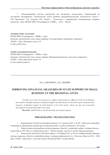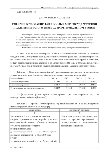 Рассмотрены новые антикризисные меры поддержки малого бизнеса, предложенные в 2015 году Правительством РФ. Определена система мер финансовой поддержки малого бизнеса в Орловской области. Предложены государственные меры финансовой поддержки малого бизнеса в Орловской области, которые могут дать ускоренное развитие предпринимательству в Орловской области
