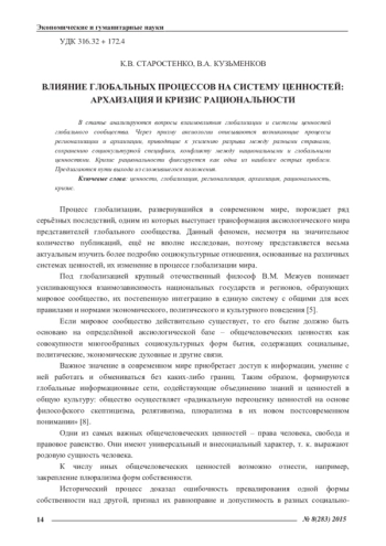 В статье анализируются вопросы взаимовлияния глобализации и системы ценностей глобального сообщества. Через призму аксиологии описываются возникающие процессы регионализации и архаизации, приводящие к усилению разрыва между разными странами, сохранению социокультурной специфики, конфликту между национальными и глобальными ценностями. Кризис рациональности фиксируется как одна из наиболее острых проблем. Предлагаются пути выхода из сложившегося положения