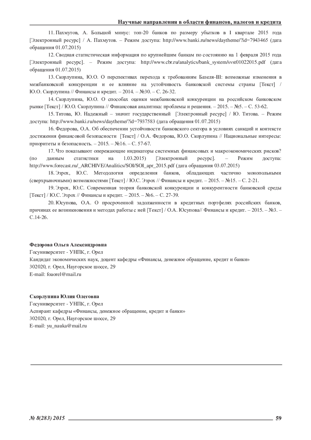 16. Федорова, О.А. Об обеспечении устойчивости банковского сектора в условиях санкций и контексте достижения финансовой безопасности [Текст] / О.А. Федорова, Ю.О. Скорлупина // Национальные интересы: приоритеты и безопасность. - 2015. - №16. - С. 57-67. EDN: TPUWAX