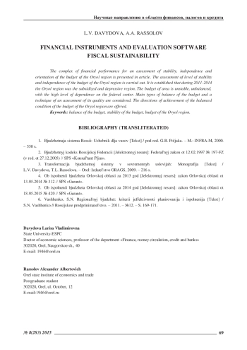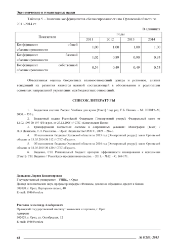 3. Трансформация бюджетной системы в современных условиях: Монография [Текст] / Л.В. Давыдова, Т.Л. Рассолова. - Орел: Издательство ОРАГС, 2009. - 216 с.