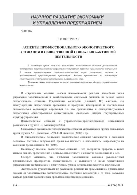 В настоящее время проблемы взаимосвязи экологического сознания руководителей предприятий, общественности и эффективного управления являются недостаточно изученными. В статье проанализирован социально-экологический опрос управленцев, экологов и представителей природоохранных организаций. Внесены предложения по активизации общественной экологической деятельности в Хабаровском крае