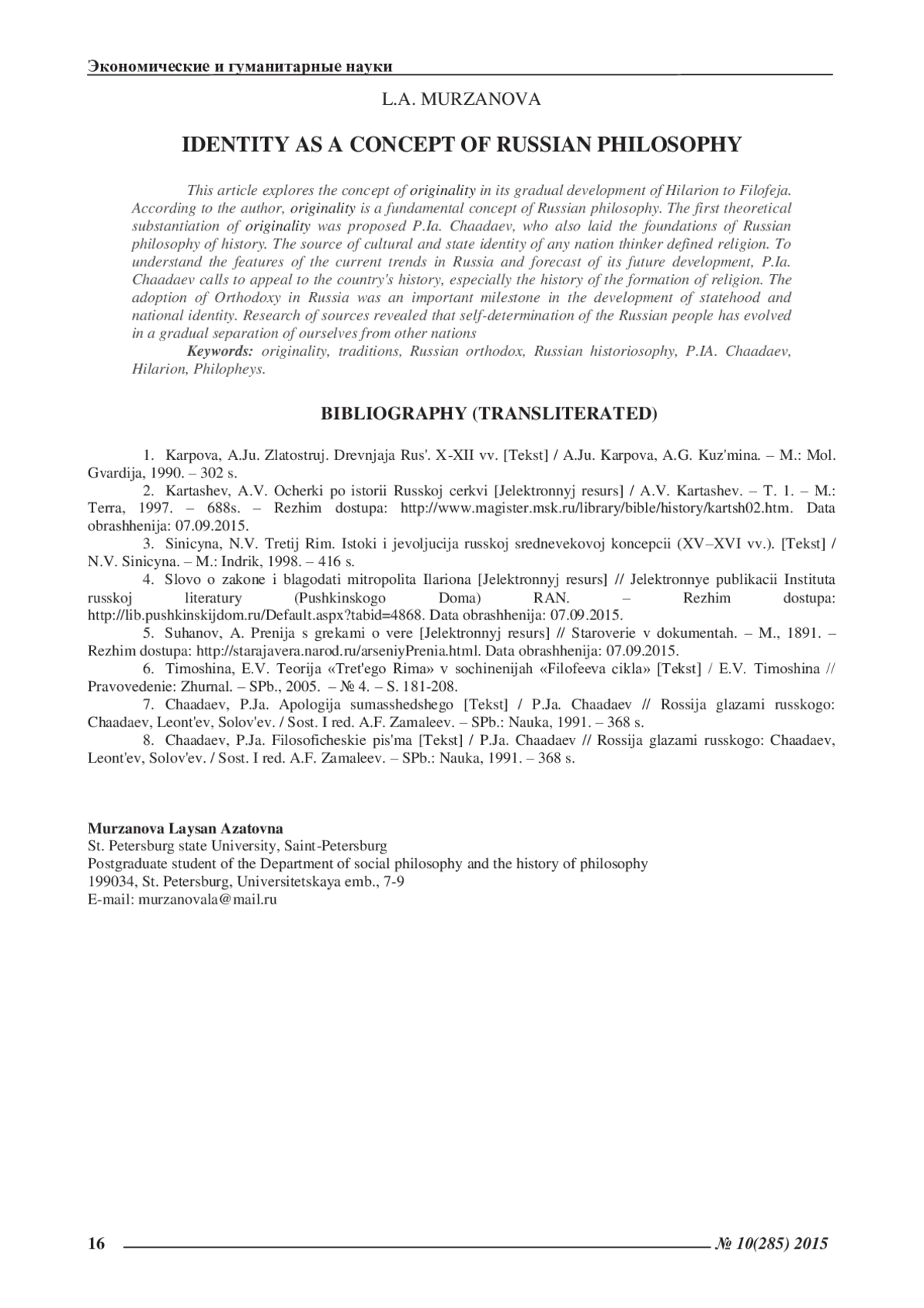 В данной статье рассматривается понятие самобытности в его последовательном развитии от Илариона до Филофея. По мнению автора, самобытность является основополагающим концептом русской философии. Впервые теоретическое обоснование самобытности было предложено П. Я. Чаадаевым, который также заложил основы русской историософии. Истоком культурного и государственного своеобразия любого народа мыслитель определял религию. Чтобы разобраться в особенностях современных тенденций в России и спрогнозировать ее будущее развитие, П. Я. Чаадаев призывает обратиться к истории страны, в особенности к истории становления религии. Принятие православия на Руси было важной вехой в становлении государственности и национального самосознания. Исследование источников показало, что самоопределение русского народа развивалось в постепенном отделении себя от других народов
