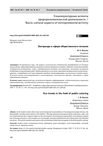 В современном мире, где вопросы экологической устойчивости приобретают всё большую актуальность, сфера общественного питания не может оставаться в стороне. Огромное количество отходов, генерируемых ресторанами, кафе и предприятиями быстрого обслуживания, оказывает негативное воздействие на окружающую среду. Ответственность за экологию становится неотъемлемой частью бизнес-практик, а потребители всё чаще выбирают заведения, демонстрирующие экологическую сознательность. В данной статье рассматриваются и анализируются экологические тренды, популярные в сфере общественного питания.