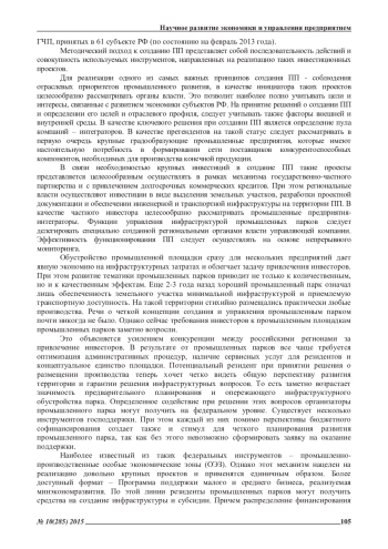 Результат исследования в статье заключается в развитии теоретических основ и методического инструментария в области реализации организационно-экономического механизма развития промышленных парков, представляющих собой совокупность экономических, хозяйственных и организационных инструментов и взаимосвязей, направленных на интеграцию крупных машиностроительных предприятий и промышленных предприятий малого и среднего бизнеса в единую производственно-технологическую сеть. Разработан методический подход к созданию промышленных парков, основанный на реализации региональных инвестиционных проектов в рамках механизма государственно-частного партнерства. Определена ведущая роль региональных органов власти в качестве инициатора и основного заказчика разработки таких проектов. В связи с необходимостью крупных инвестиций в создание промышленных парков определена целесообразность их осуществления в рамках механизма государственно-частного партнерства