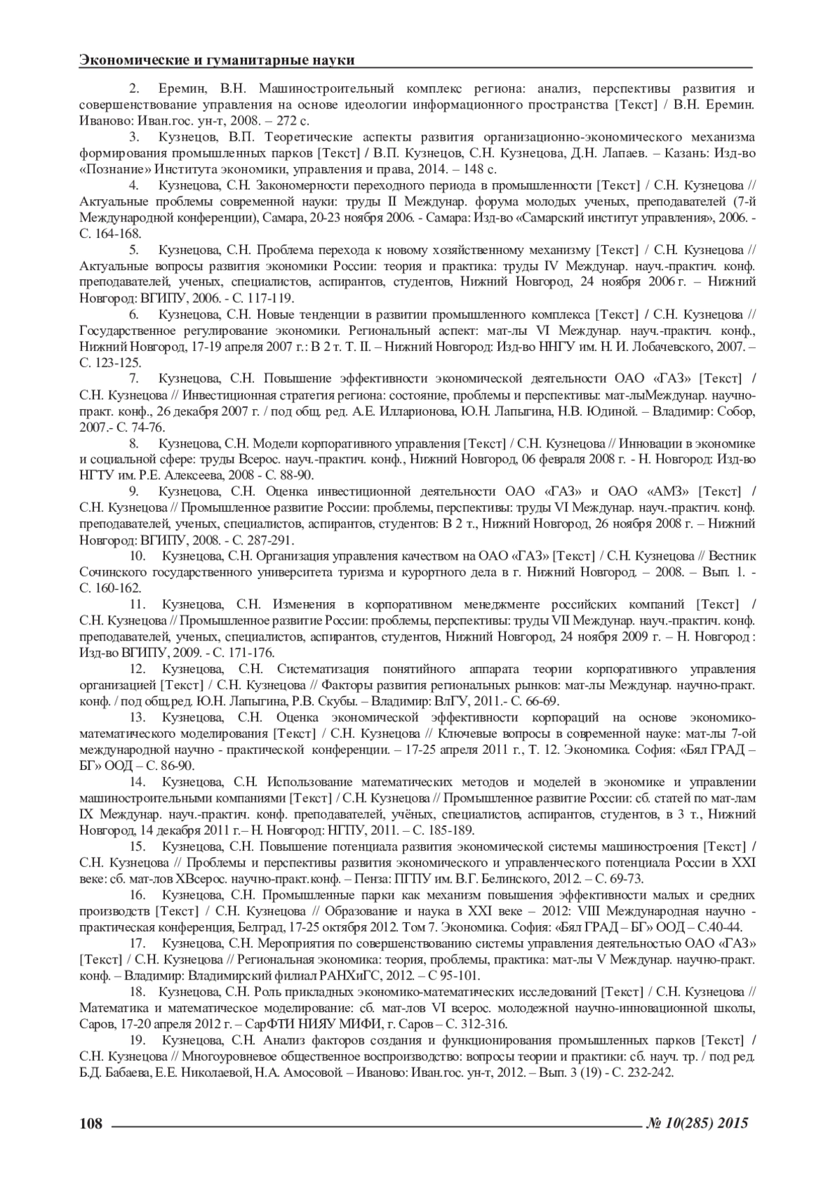 17. Кузнецова, С.Н. Мероприятия по совершенствованию системы управления деятельностью ОАО «ГАЗ» [Текст] / С.Н. Кузнецова // Региональная экономика: теория, проблемы, практика: мат-лы V Междунар. научно-практ. конф. - Владимир: Владимирский филиал РАНХиГС, 2012. - С 95-101.