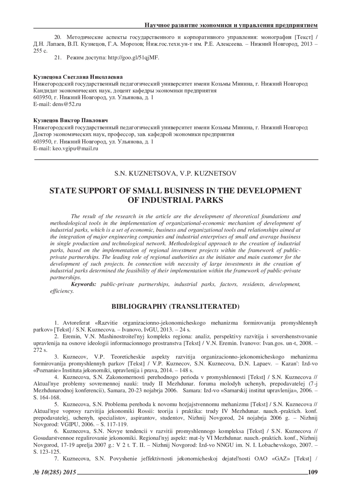 1. Автореферат «Развитие организационно-экономического механизма формирования промышленных парков» [Текст] / С.Н. Кузнецова. - Иваново, ИвГУ, 2013. - 24 с.