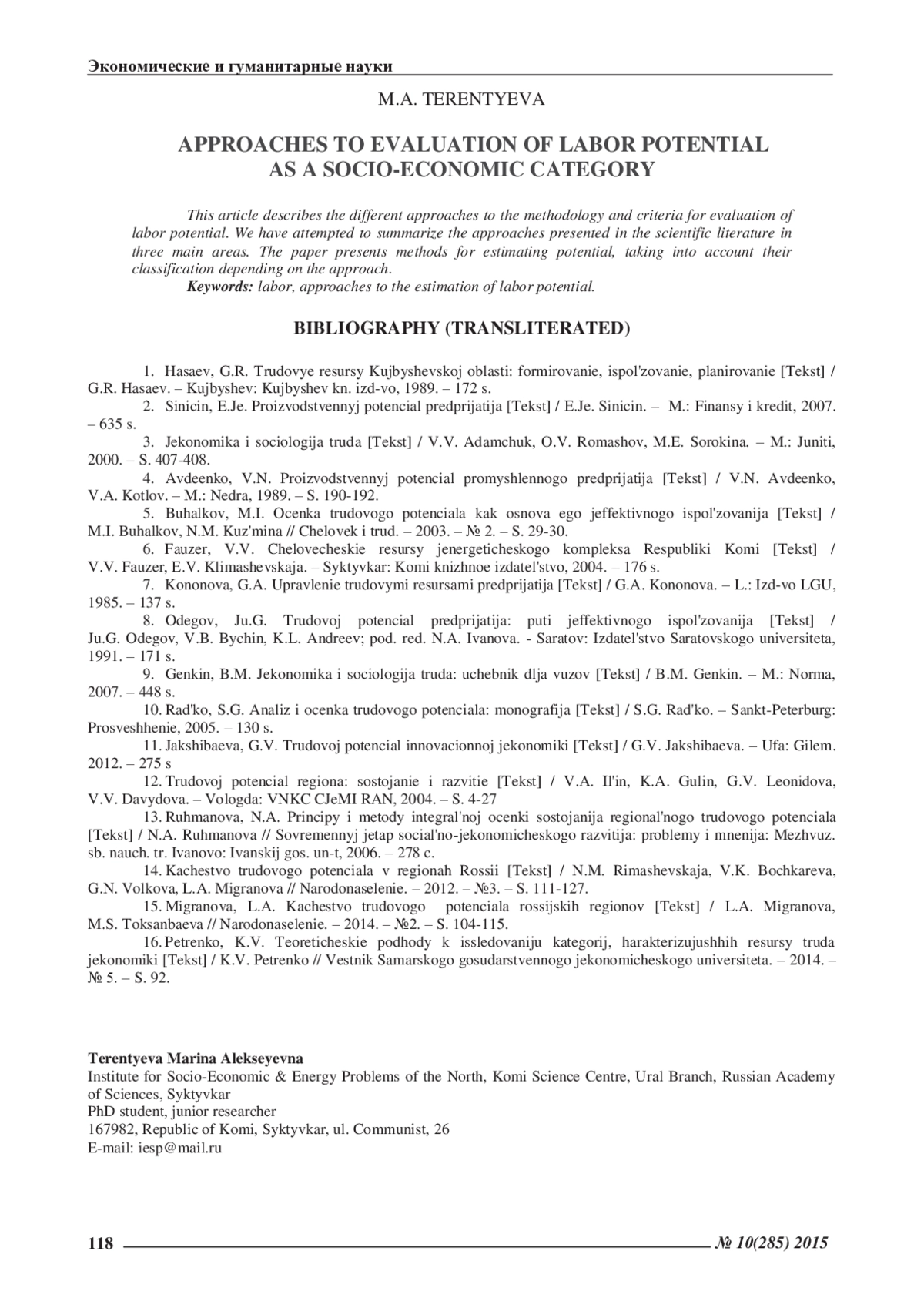 15. Мигранова, Л.А. Качество трудового потенциала российских регионов [Текст] / Л.А. Мигранова, М.С. Токсанбаева // Народонаселение. - 2014. - №2. - С. 104-115. EDN: SJFYSZ