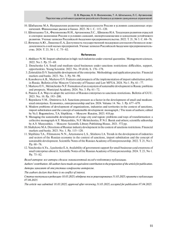 12. Янченко А.Ю., Ляшенко Е.А. Доступность государственной поддержки для малого бизнеса и осведомленность о ней малых предприятий. Ученые записки Российской Академии предпринимательства. 2024. Т. 23, № 1. С. 75-82.