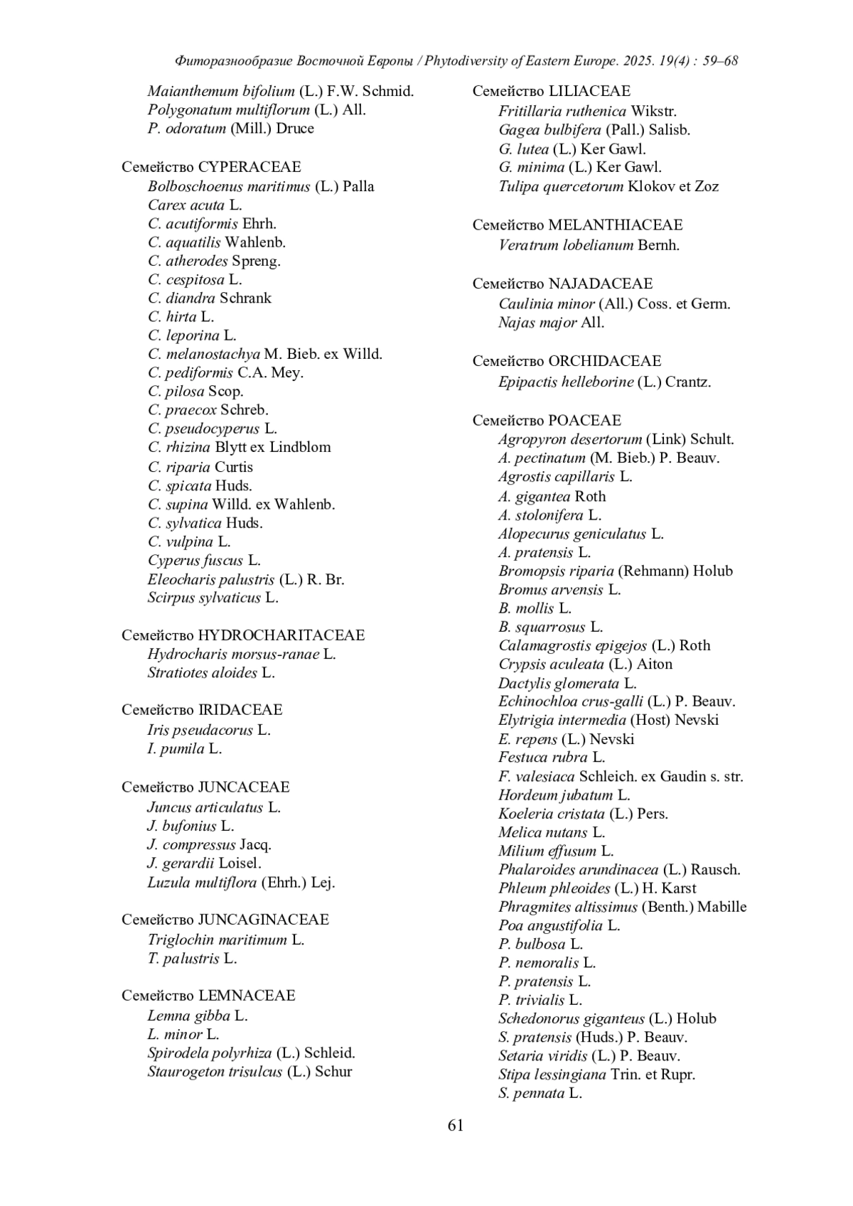 В период с 2022 по 2025 гг. была проведена инвентаризация флоры государственного федерального заказника «Цимлянский» расположенного на территории Ростовской области. По результатам первой инвентаризации флоры заказника было выявлено 426 таксонов сосудистых растений представителей 71 семейства. Из всей выявленной флоры 18 видов включены в Красную книгу Ростовской области (Red…, 2024) и 4 вида - Fritillaria ruthenica Wikstr., Tulipa suaveolens Roth, Pulsatilla pratensis (L.) Mill., Pinus nigra subsp. pallasiana (Lamb.) Holmboe - включены в Красную книгу Российской Федерации (Red…, 2024). Один вид, Salix fursaevii Mavrodiev, приводится для Ростовской области впервые.