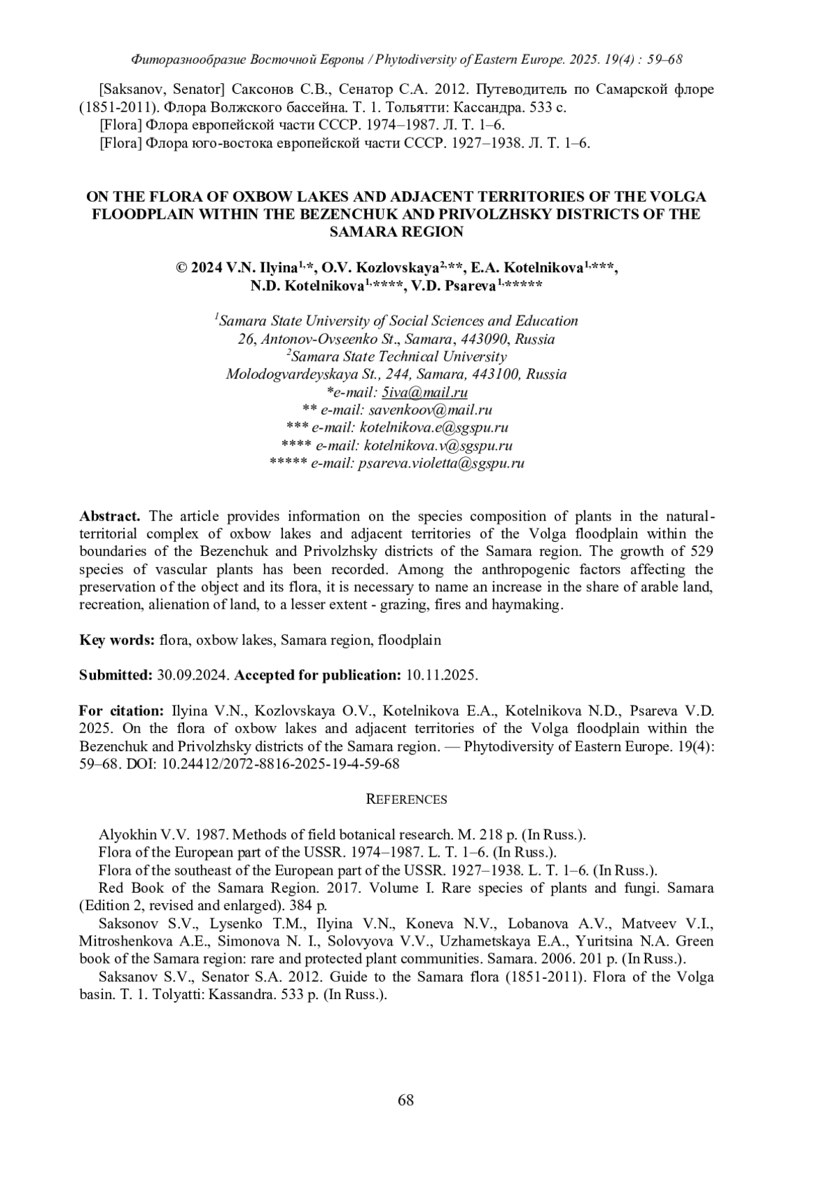 4. [Saksanov, Senator] Саксонов С.В., Сенатор С.А. 2012. Путеводитель по Самарской флоре (1851-2011). Флора Волжского бассейна. Т. 1. Тольятти: Кассандра. 533 с. EDN: SBSRMD