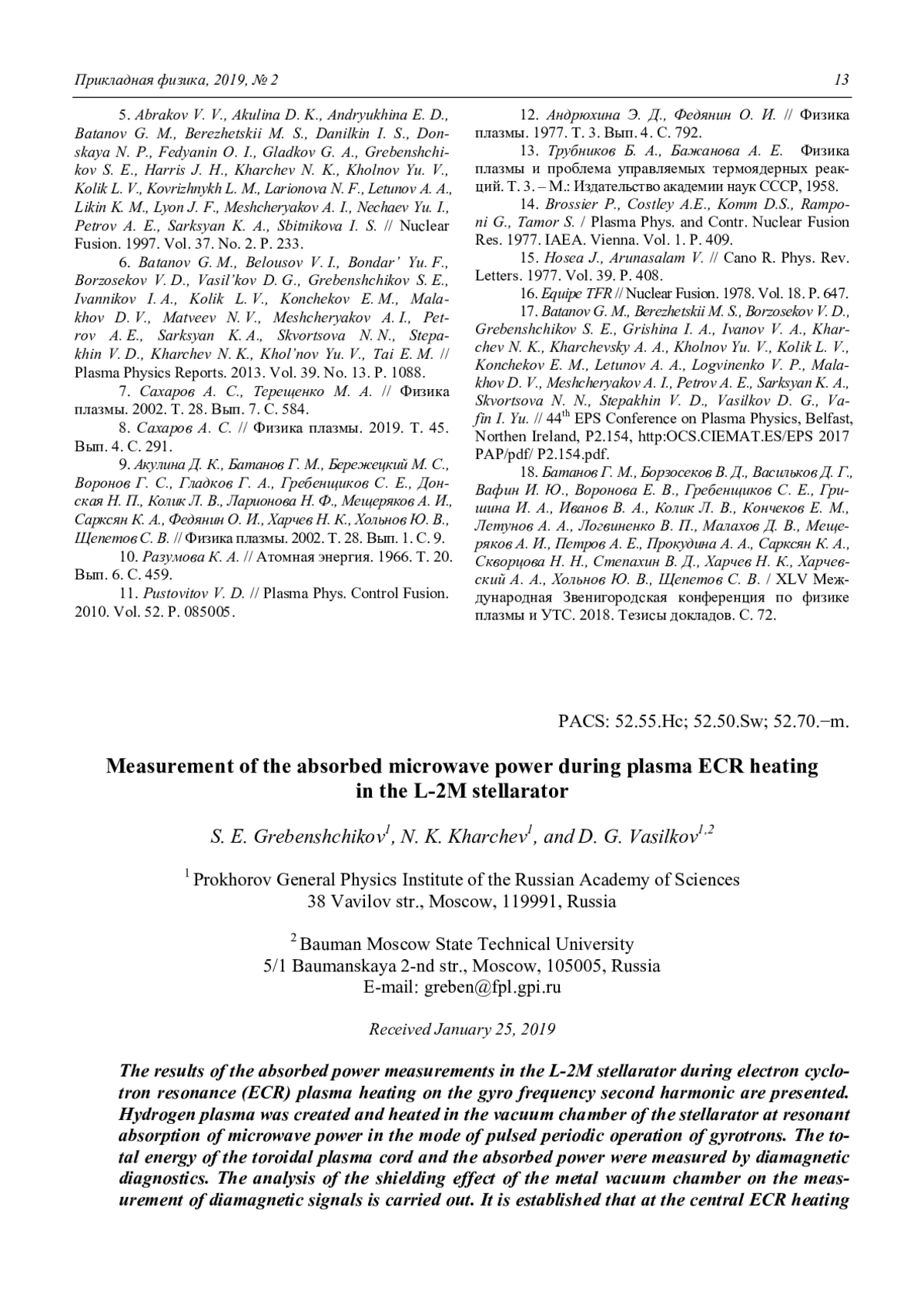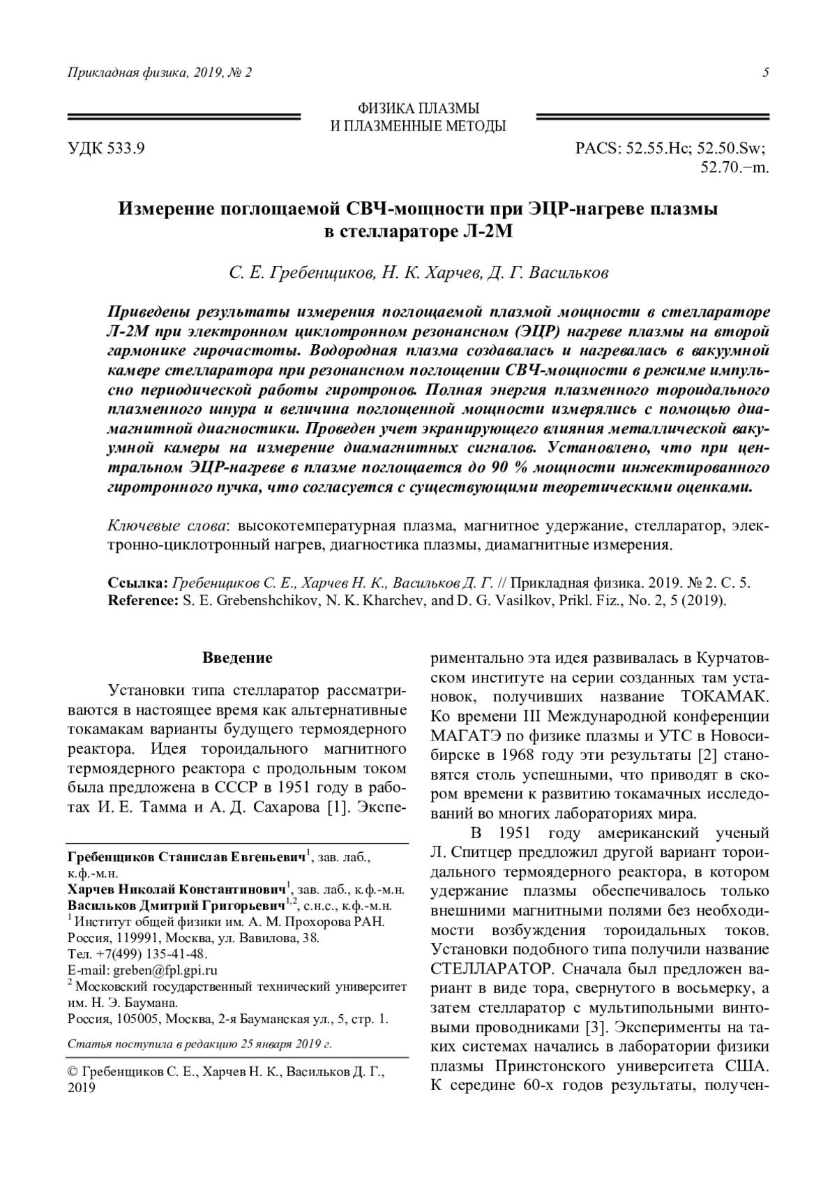 ГРЕБЕНЩИКОВ С. Е., ХАРЧЕВ Н. К., ВАСИЛЬКОВ Д. Г. ИЗМЕРЕНИЕ ПОГЛОЩАЕМОЙ СВЧ-МОЩНОСТИ ПРИ ЭЦР-НАГРЕВЕ ПЛАЗМЫ В СТЕЛЛАРАТОРЕ Л-2М // ПРИКЛАДНАЯ ФИЗИКА. 2019. №2