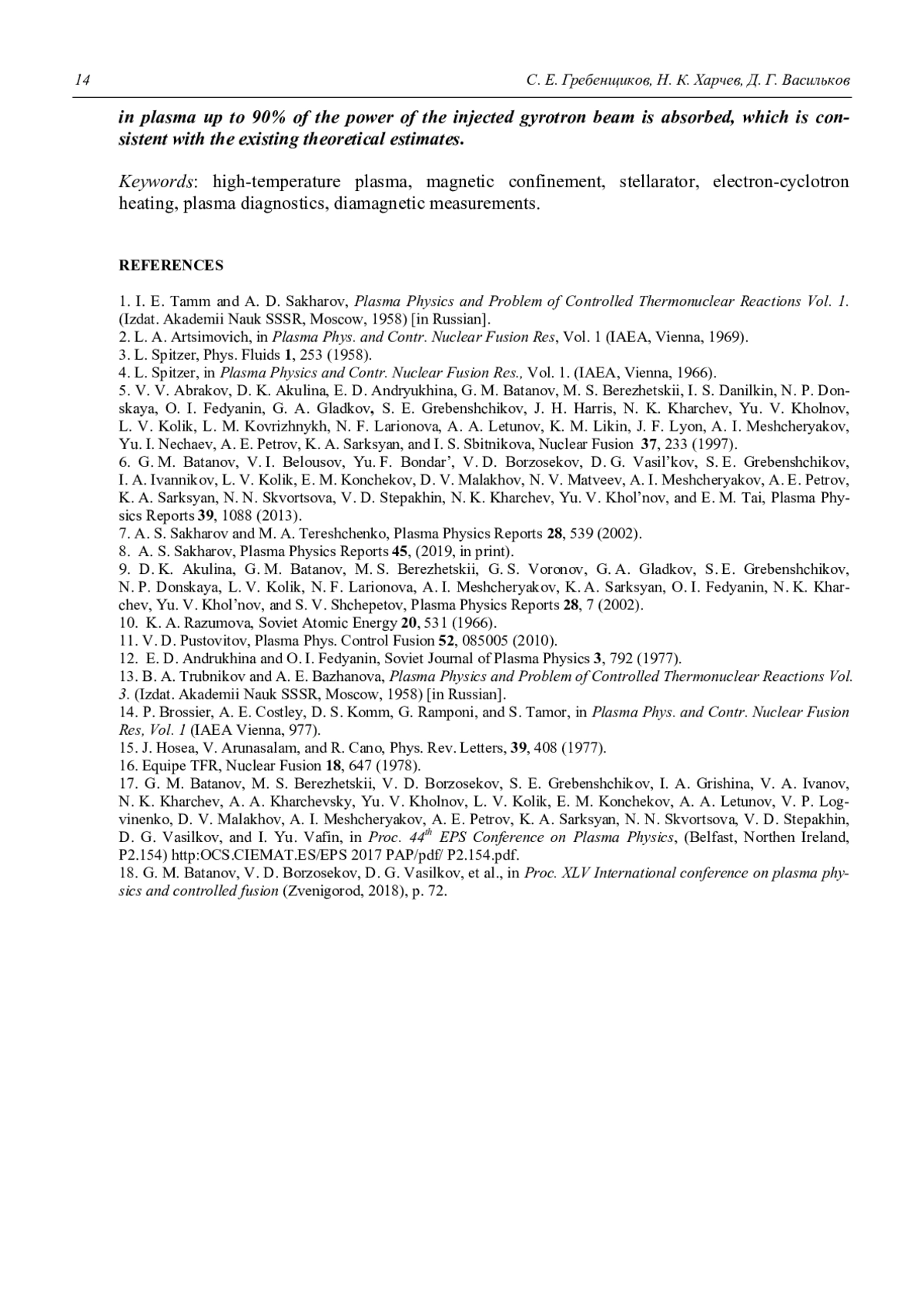 Ключевые фразы: высокотемпературная плазма, магнитное удержание, стелларатор, элек- тронно-циклотронный нагрев, диагностика плазмы, диамагнитные измерения