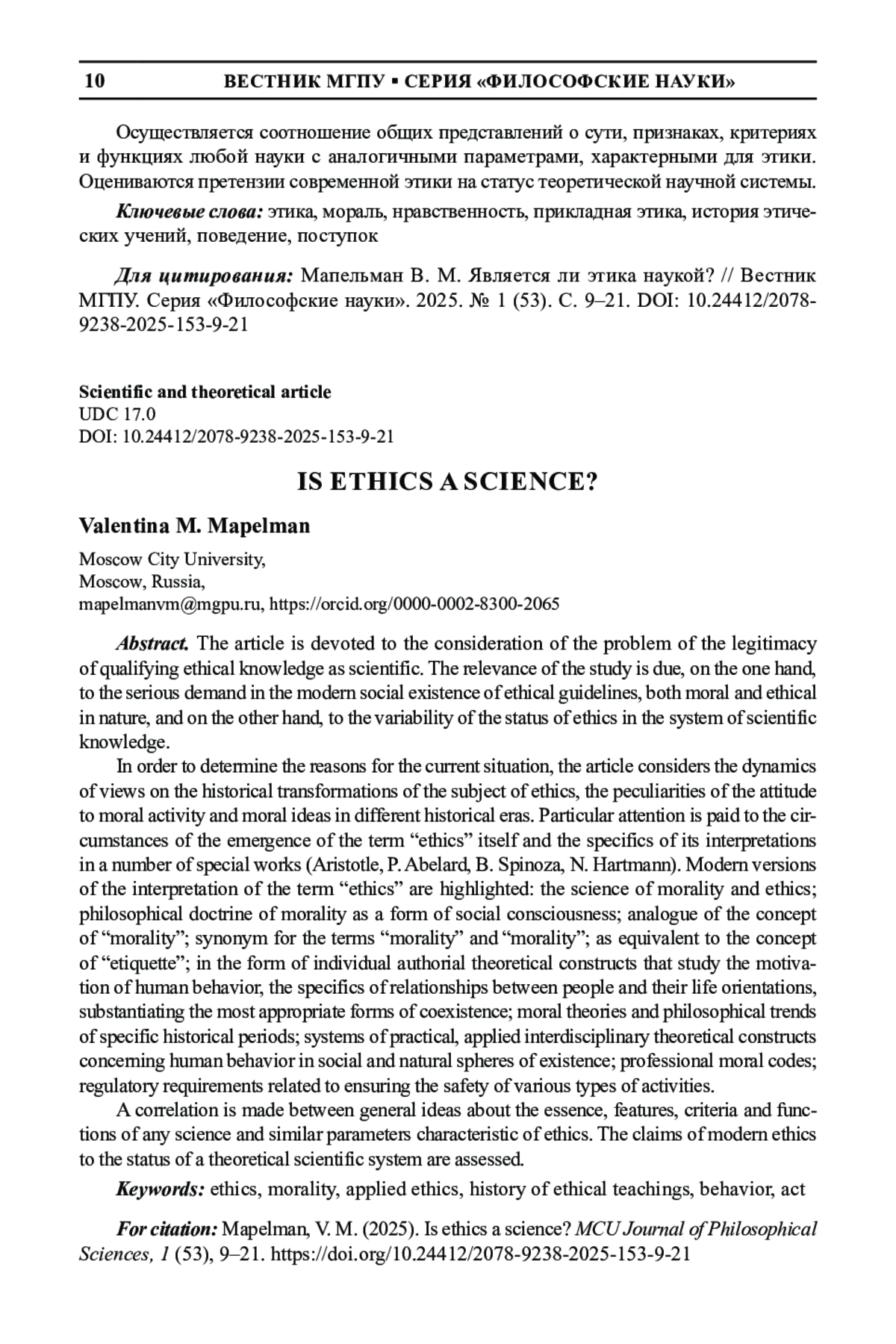 Статья посвящена рассмотрению проблемы правомерности квалификации этического знания в качестве научного. Актуальность исследования обусловлена, с одной стороны, серьезной востребованностью в современном социальном существовании этических ориентиров, как морального, так и нравственного характера, а с другой стороны, вариативностью статуса этики в системе научного знания. Для определения причин создавшейся ситуации в статье рассматривается динамика взглядов на исторические трансформации предмета этики, особенности отношения к нравственной деятельности и моральным идеям в разные исторические эпохи. Особое внимание уделяется обстоятельствам появления самого термина «этика» и специфике его трактовок в ряде специальных трудов (Аристотель, П. Абеляр, Б. Спиноза, Н. Гартман). Выделяются современные варианты толкования термина «этика»: наука о морали и нравственности; философское учение о морали как форме общественного сознания; аналог понятия «мораль»; синоним терминов «мораль» и «нравственность»; в качестве равноценного понятию «этикет»; в виде отдельных авторских теоретических построений, исследующих мотивацию поведения человека, специфику отношений между людьми и их жизненные ориентации, обосновывающие наиболее целесообразные формы совместного сосуществования; моральные теории и философские течения конкретных исторических периодов; системы практических, прикладных междисциплинарных теоретических построений, касающихся поведения людей в социальных и природных сферах бытия; профессиональные моральные кодексы; нормативные требования, связанные с обеспечением безопасности различных видов деятельности. Осуществляется соотношение общих представлений о сути, признаках, критериях и функциях любой науки с аналогичными параметрами, характерными для этики. Оцениваются претензии современной этики на статус теоретической научной системы.