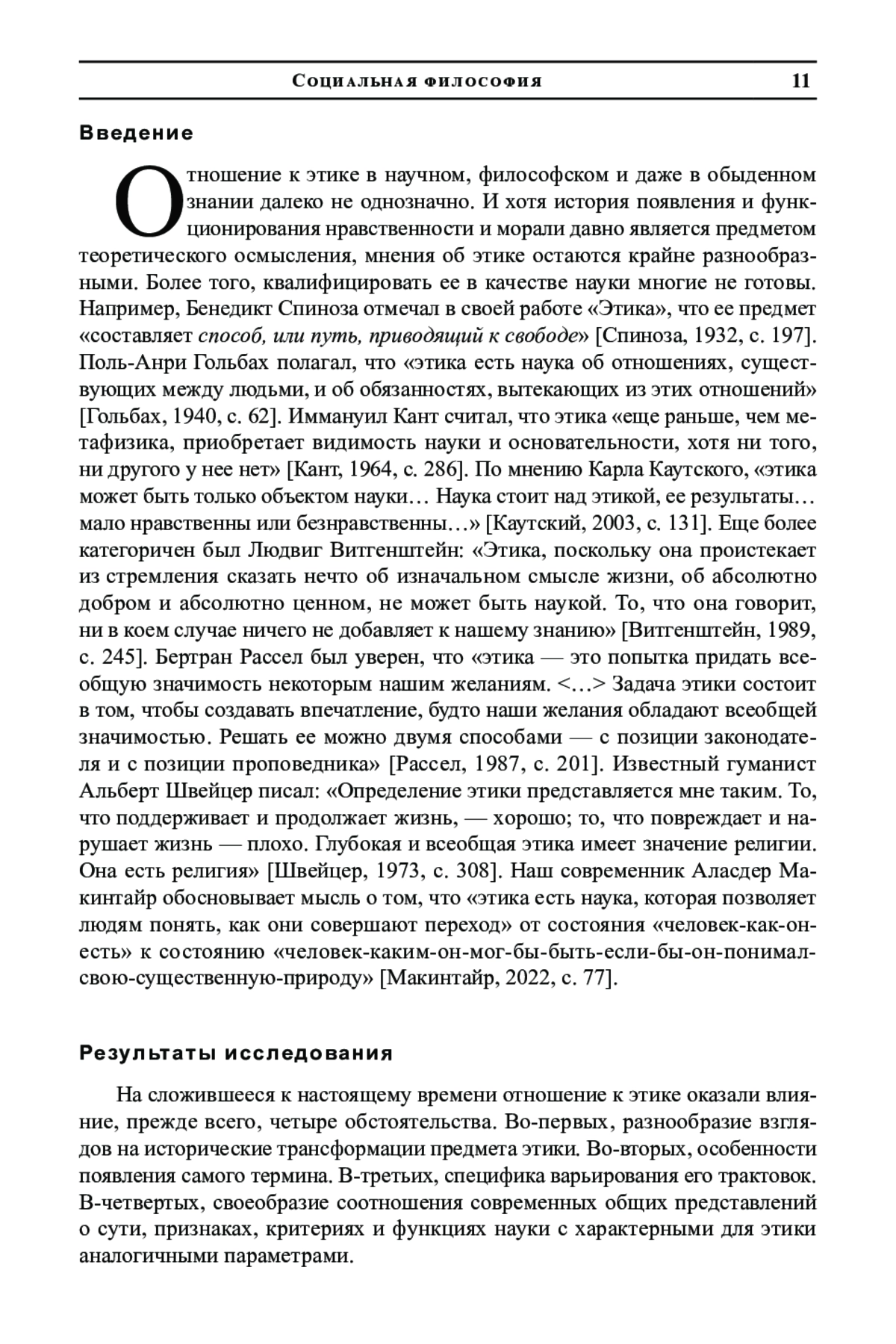 Отношение к этике в научном, философском и даже в обыденном знании далеко не однозначно. И хотя история появления и функционирования нравственности и морали давно является предметом теоретического осмысления, мнения об этике остаются крайне разнообразными. Более того, квалифицировать ее в качестве науки многие не готовы. Например, Бенедикт Спиноза отмечал в своей работе «Этика», что ее предмет «составляет способ, или путь, приводящий к свободе» [Спиноза, 1932, с. 197]. Поль-Анри Гольбах полагал, что «этика есть наука об отношениях, существующих между людьми, и об обязанностях, вытекающих из этих отношений» [Гольбах, 1940, с. 62].