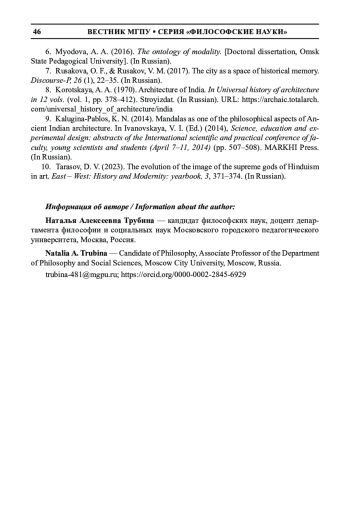 9. Калугина-Паблос К. Н. Мандалы как один из философских аспектов архитектуры Древней Индии // Наука, образование и экспериментальное проектирование: тезисы докладов Международной научно-практической конференции профессорско-преподавательского состава, молодых ученых и студентов (7-11 апреля 2014 г.) / отв. ред. В. И. Ивановская. М.: МАРХИ, 2014. С. 507-508. EDN: TMXJAV