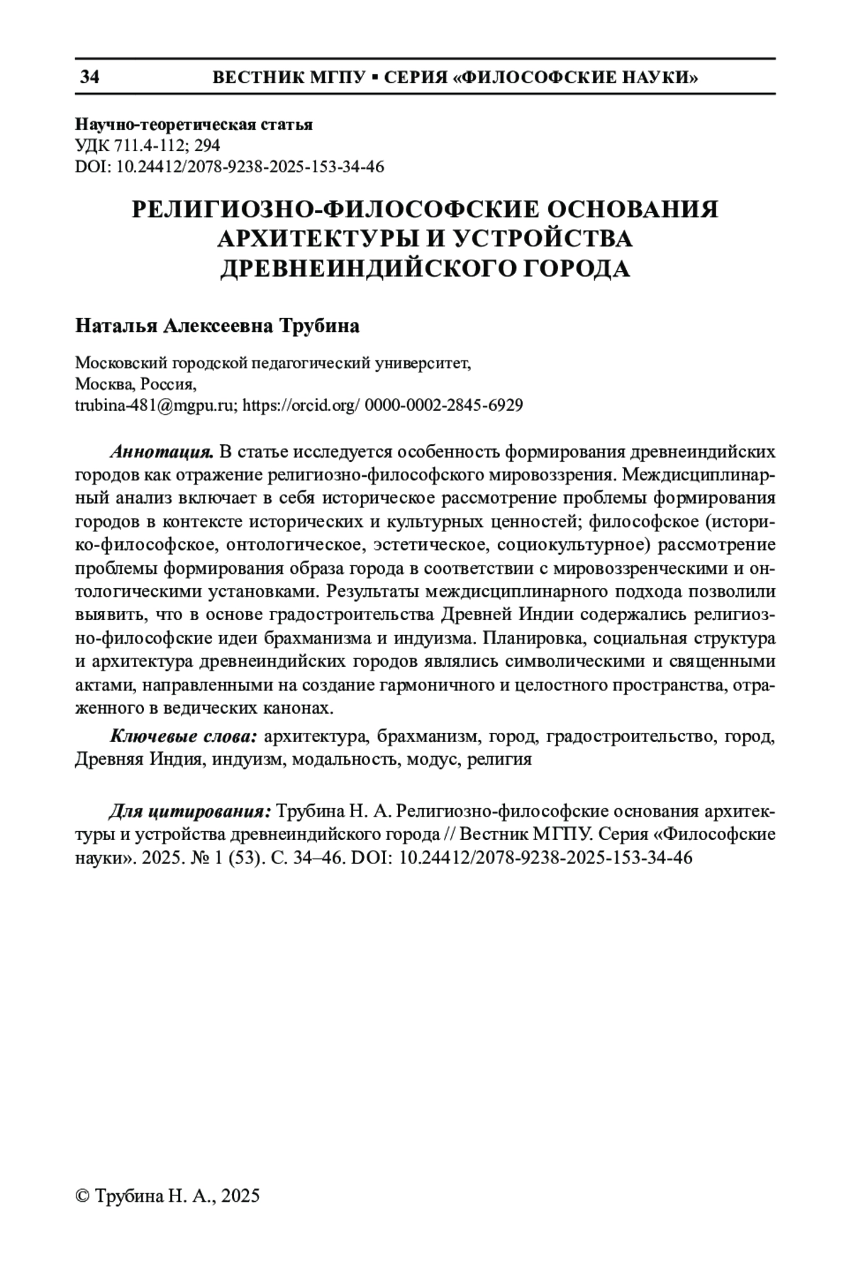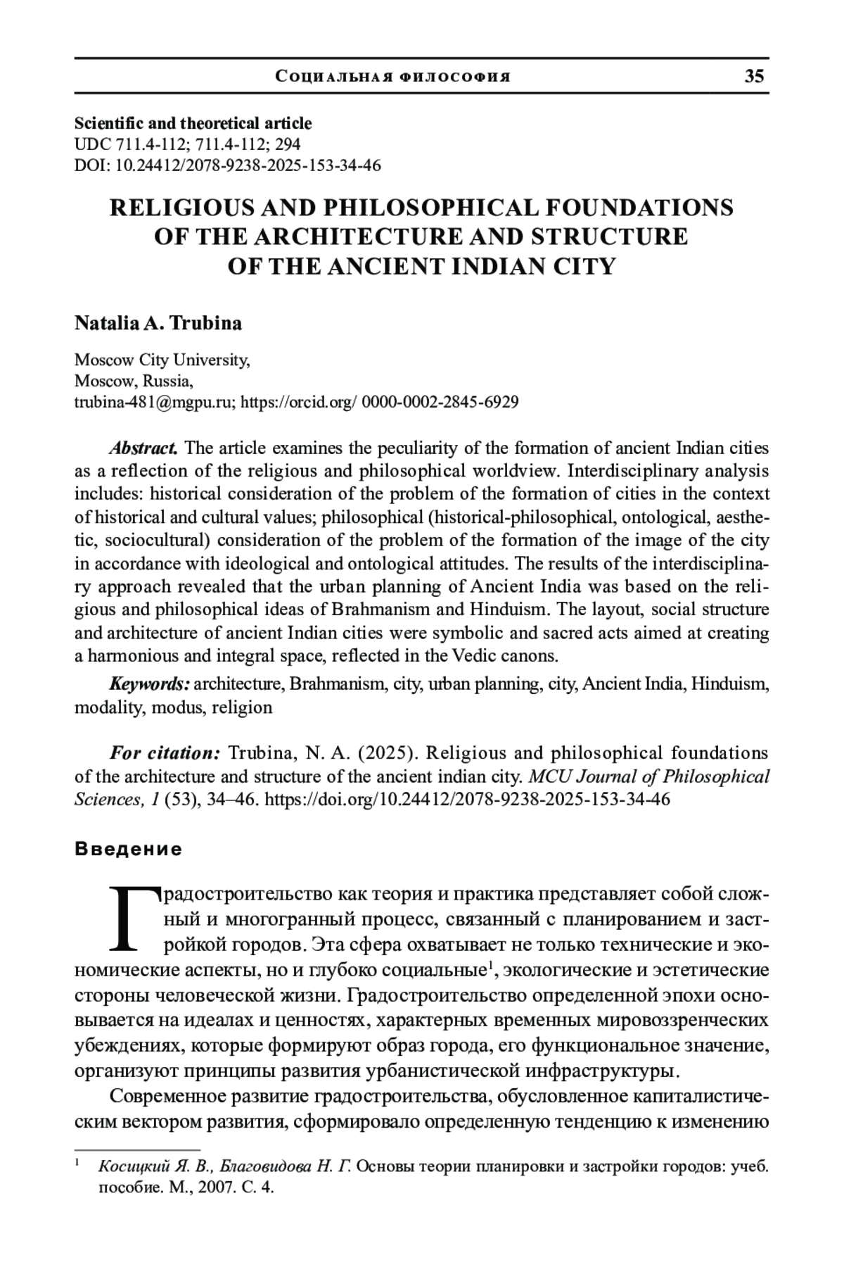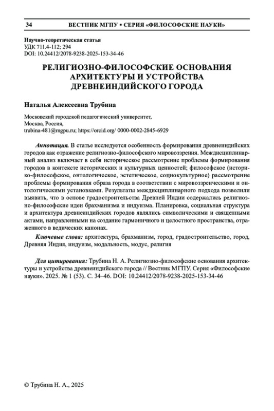 В статье исследуется особенность формирования древнеиндийских городов как отражение религиозно-философского мировоззрения. Междисциплинарный анализ включает в себя историческое рассмотрение проблемы формирования городов в контексте исторических и культурных ценностей; философское (историко-философское, онтологическое, эстетическое, социокультурное) рассмотрение проблемы формирования образа города в соответствии с мировоззренческими и онтологическими установками. Результаты междисциплинарного подхода позволили выявить, что в основе градостроительства Древней Индии содержались религиозно-философские идеи брахманизма и индуизма. Планировка, социальная структура и архитектура древнеиндийских городов являлись символическими и священными актами, направленными на создание гармоничного и целостного пространства, отраженного в ведических канонах.