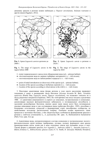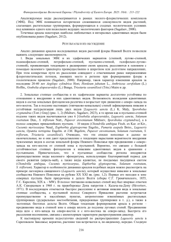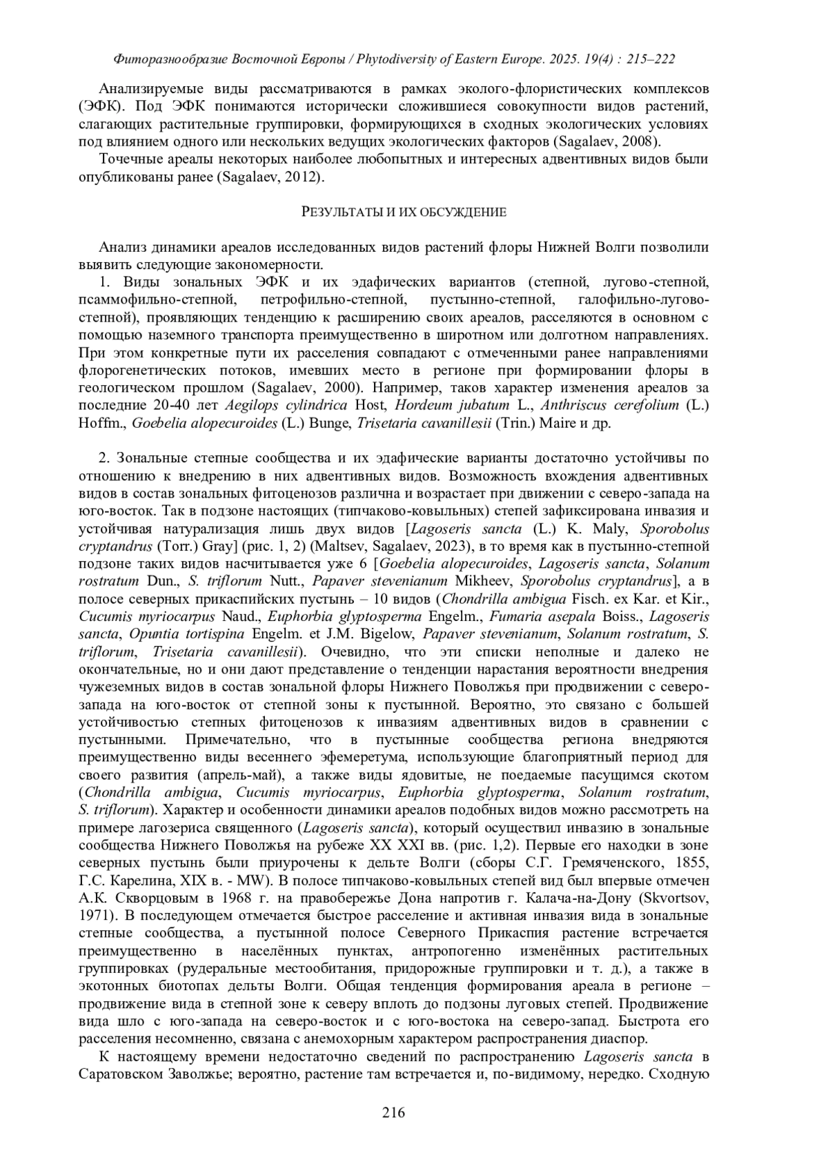 Зональные степные сообщества и их эдафические варианты достаточно устойчивы по отношению к внедрению в них адвентивных видов. Возможность вхождения адвентивных видов в состав зональных фитоценозов различна и возрастает при движении с северо-запада на юго-восток. Так в подзоне настоящих (типчаково-ковыльных) степей зафиксирована инвазия и устойчивая натурализация лишь двух видов [Lagoseris sancta (L.) K. Maly, Sporobolus cryptandrus (Torr.) Gray] (рис. 1, 2) (Maltsev, Sagalaev, 2023), в то время как в пустынно-степной подзоне таких видов насчитывается уже 6 [Goebelia alopecuroides, Lagoseris sancta, Solanum rostratum Dun., S. triflorum Nutt., Papaver stevenianum Mikheev, Sporobolus cryptandrus], а в полосе северных прикаспийских пустынь – 10 видов (Chondrilla ambigua Fisch. ex Kar. et Kir., Cucumis myriocarpus Naud., Euphorbia glyptosperma Engelm., Fumaria asepala Boiss., Lagoseris sancta, Opuntia tortispina Engelm. et J. M. Bigelow, Papaver stevenianum, Solanum rostratum, S. triflorum, Trisetaria cavanillesii).