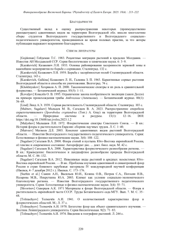 12. Sagalaev V. A. 2008. Characteristics of the floristic diversity of the region. - Local history: biological and landscape diversity of the nature of the Volgograd region. Moscow. P. 86-132.