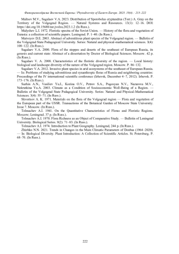 8. Maltsev M.V., Sagalaev V.A. 2023. Distribution of Sporobolus cryptandrus (Torr.) A. Gray on the Territory of the Volgograd Region. - Natural Systems and Resources. 13(1): 12-16. (In Russ.). DOI: 10.15688/nsr.jvolsu.2023.1.2