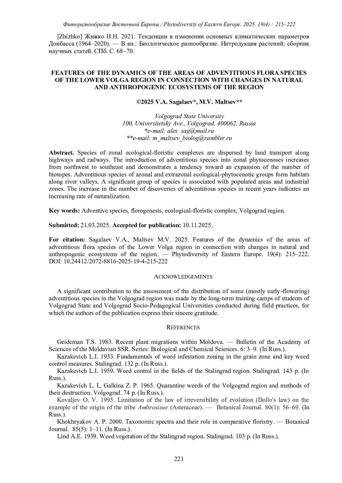 13. Sagalaev V.A. 2012. Invasive plant species in arid ecosystems of the southeast of European Russia. - In: Problems of studying adventitious and synanthropic floras of Russia and neighboring countries: Proceedings of the IV international scientific conference (Izhevsk, December 4-7, 2012). Izhevsk. P. 173-176. (In Russ.).