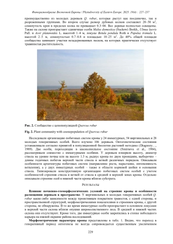 С использованием современных биоморфологических подходов исследовано строение кроны у молодых особей Quercus robur L., произрастающих на выходах песков с редкой травянистой растительностью на склоне надпойменной террасы р. Большой Черемшан (Мелекесский район Ульяновской области). Всего изучено 106 деревьев. Локус имматурных особей нормальной и пониженной жизненности расположен в верхней части склона вблизи опушки леса. В остальных частях склона имматурные растения встречаются крайне редко и имеют пониженную и низкую жизненность. Виргинильные и молодые генеративные особи произрастают вдоль всего склона, и имеют в основном нормальную жизненность. В имматурном онтогенетическом состоянии преобладают растения с ортотропным стволом и редкими восходящими ветвями. Строение кроны в виргинильном и молодом генеративном состояниях сводится к трем типам. 1 - ортотропный ствол и восходящие ветви, 2 - ортотропный ствол и преимущественно плагиотропные ветви, 3 - переходящий от ортотропного к плагиотропному направлению роста ствол, плагиотропные и восходящие ветви. Преобладают особи типа 1. У большинства особей всех онтогенетических состояний в приземной части ствола сформирован комплекс осей, включающий один или несколько следующих элементов: либо плагиотропные/восходящие ветви, либо стелющиеся по поверхности субстрата оси, либо дополнительные стволы, уступающие по развитию основному. У двух имматурных особей выявлен ксилоподий.
