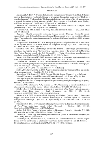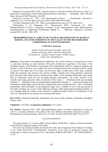 17. [Stamenov] Стаменов М.Н. 2024. Строение кроны у молодых особей дуба Quercus robur L. в различных сообществах южной тайги Нижегородского Заволжья. - Биосфера. 16(4): 450-461. DOI: 10.24855/biosfera.v16i4.958 EDN: XODWFU