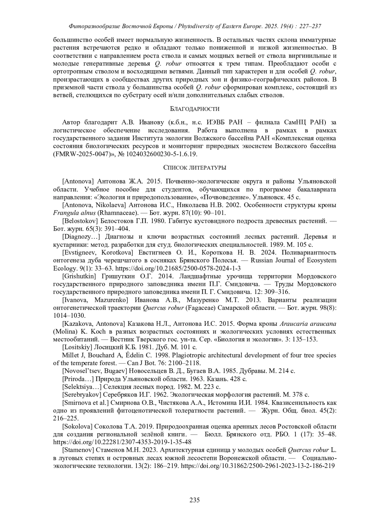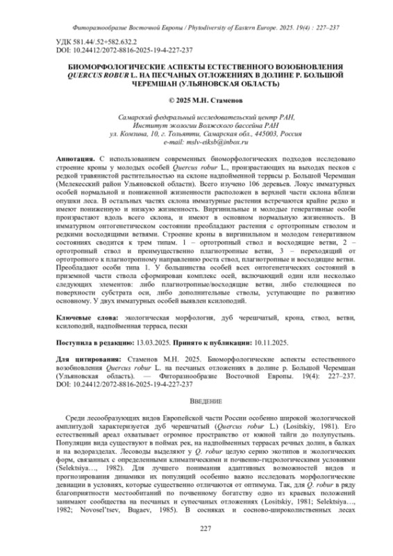 16. [Stamenov] Стаменов М.Н. 2023. Архитектурная единица у молодых особей Quercus robur L. в луговых степях и островных лесах южной лесостепи Воронежской области. - Социально-экологические технологии. 13(2): 186-219. DOI: 10.31862/2500-2961-2023-13-2-186-219 EDN: YHNNFS