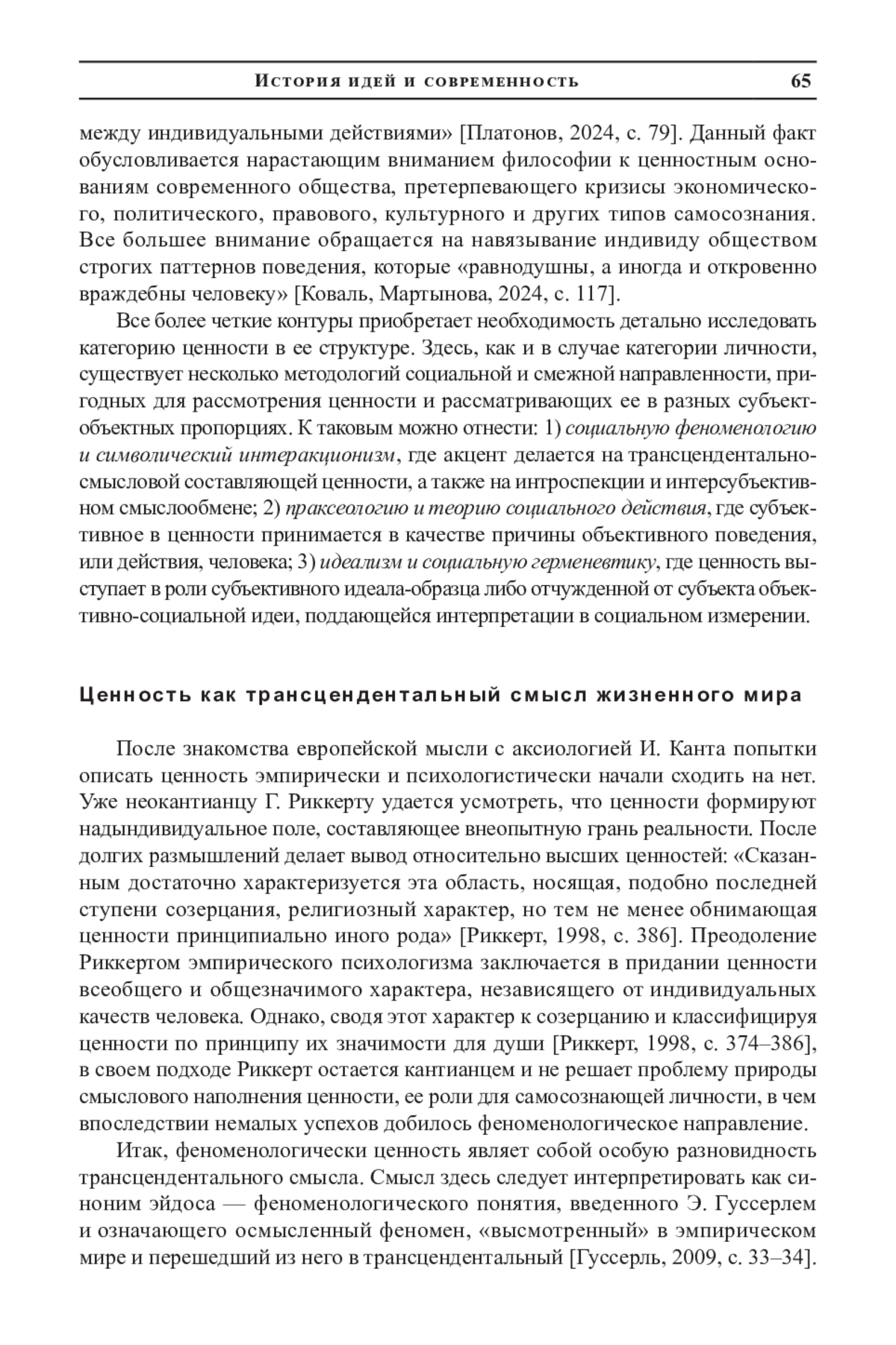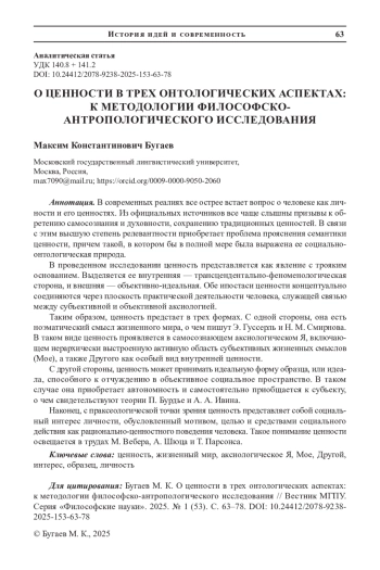 Таким образом, ценность предстает в трех формах. С одной стороны, она есть ноэматический смысл жизненного мира, о чем пишут Э. Гуссерль и Н. М. Смирнова. В таком виде ценность проявляется в самосознающем аксиологическом Я, включающем иерархически выстроенную активную область субъективных жизненных смыслов (Мое), а также Другого как особый вид внутренней ценности. С другой стороны, ценность может принимать идеальную форму образца, или идеала, способного к отчуждению в объективное социальное пространство. В таком случае она приобретает автономность и самостоятельно приобщается к субъекту, о чем свидетельствуют теории П. Бурдье и А. А. Ивина.