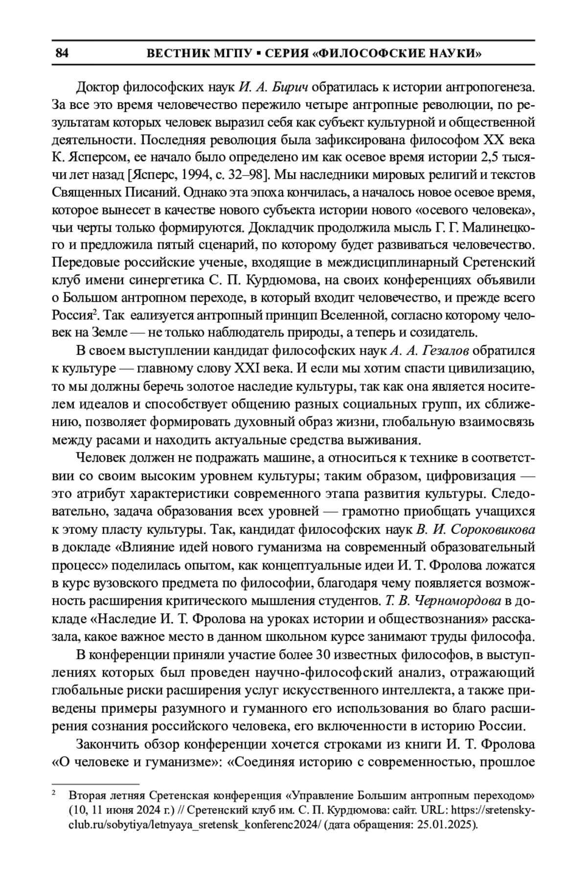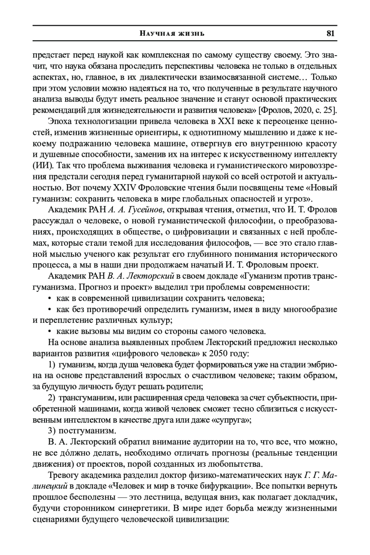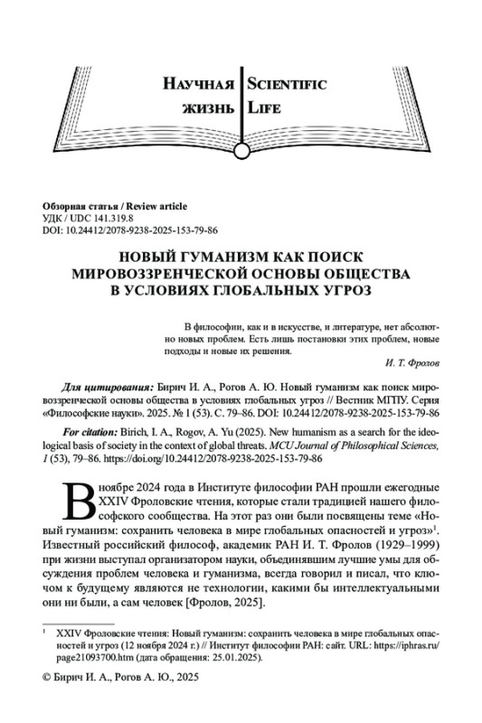 В ноябре 2024 года в Институте философии РАН прошли ежегодные XXIV Фроловские чтения, которые стали традицией нашего философского сообщества. На этот раз они были посвящены теме «Новый гуманизм: сохранить человека в мире глобальных опасностей и угроз». Известный российский философ, академик РАН И. Т. Фролов (1929–1999) при жизни выступал организатором науки, объединявшим лучшие умы для обсуждения проблем человека и гуманизма, всегда говорил и писал, что ключом к будущему являются не технологии, какими бы интеллектуальными они ни были, а сам человек [Фролов, 2025].