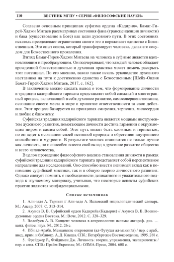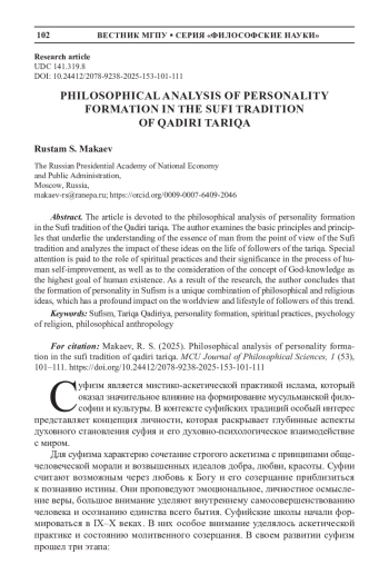 Статья посвящена философскому анализу формирования личности в суфийской традиции кадирийского тариката. Автор рассматривает основные принципы и положения, которые лежат в основе понимания сущности человека с точки зрения суфийской традиции, а также анализирует влияние этих идей на жизнь последователей тариката. Особое внимание уделяется роли духовных практик и их значению в процессе самосовершенствования человека, а также рассмотрению концепции богопознания как высшей цели человеческого существования. В результате исследования автор приходит к выводу о том, что формирование личности в суфизме представляет собой уникальное сочетание философских и религиозных идей, которое оказывает глубокое влияние на мировоззрение и образ жизни последователей этого направления.
