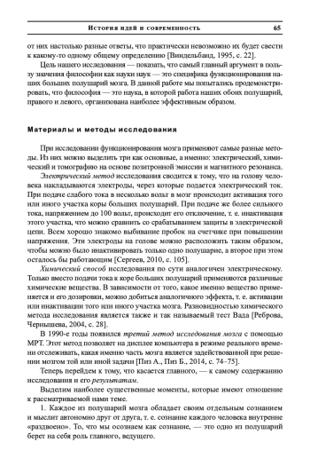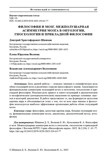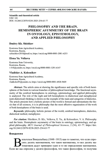 Цель данной работы - показать значение и специфическую роль обоих полушарий мозга в различных отраслях философского знания. Анализируется функциональная асимметрия полушарий мозга в онтологии, гносеологии и прикладной философии. Показана роль правого и левого полушарий в диалектическом и метафизическом (антидиалектическом) мышлении на примере основных законов и категорий диалектики. В работе представлено то, как формируется целостная картина мира и обосновывается тезис о том, что из всех наук именно в философии используется наиболее эффективная организация работы обоих полушарий мозга.