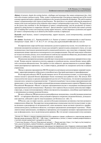 В настоящее время, несмотря на существующие барьеры, вызовы и стереотипы, с которыми сталкиваются женщины–предприниматели, их роль в экономике продолжает расти. Сегодня женское предпринимательство становится важной частью общей экономической повестки и вносит значительный вклад в концепцию устойчивого развития. Статья рассматривает женское предпринимательство в контексте малого бизнеса. Основное внимание уделяется статистике, отражающей долю женщин в этом секторе, и анализу ключевых отраслей, где женское предпринимательство наиболее активно. В работе акцентируется внимание на факторах, способствующих развитию женского предпринимательства, и особенностях женского подхода к ведению бизнеса по сравнению с мужским. Особое внимание уделяется рассмотрению барьеров, с которыми сталкиваются женщины в настоящий момент при построении своей карьеры и анализу существующих мер поддержки, а также подчеркивается важность внимания и поддержки женского предпринимательства как элемента современной экономики.