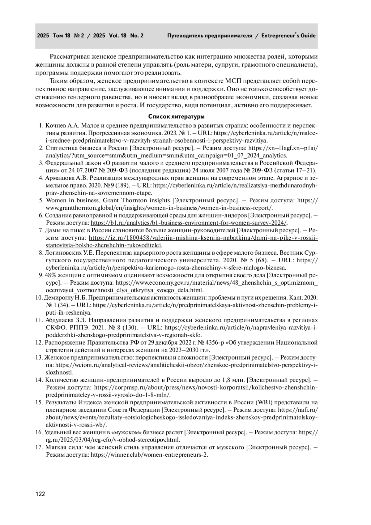 11. Абдулаева З.З. Направления развития и поддержки женского предпринимательства в регионах СКФО. РППЭ. 2021. № 8 (130). - URL: https://cyberleninka.ru/article/n/napravleniya-razvitiya-i-podderzhki-zhenskogo-predprinimatelstva-v-regionah-skfo.
