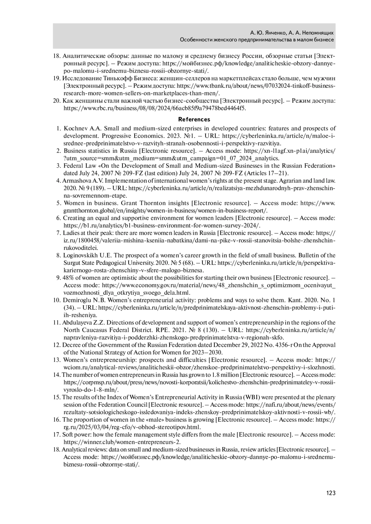 8. Логиновских У.Е. Перспектива карьерного роста женщины в сфере малого бизнеса. Вестник Сургутского государственного педагогического университета. 2020. № 5 (68). - URL: https://cyberleninka.ru/article/n/perspektiva-kariernogo-rosta-zhenschiny-v-sfere-malogo-biznesa.