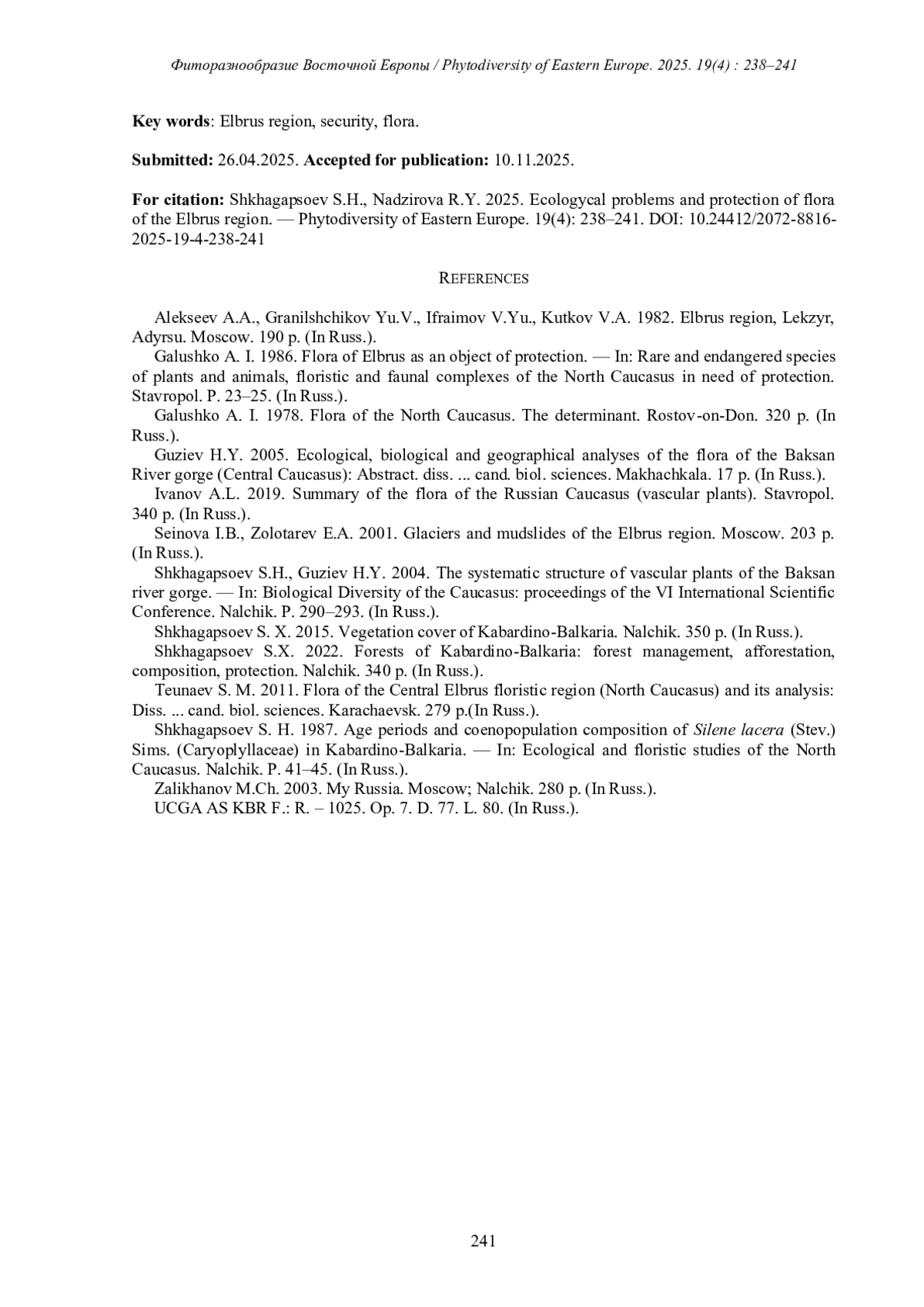 2. [Galushko] Галушко А. И. 1986. Флора Эльбруса как объект охраны. - В кн.: Редкие и исчезающие виды растений и животных, флористические и фаунистические комплексы Северного Кавказа, нуждающиеся в охране. Ставрополь. С. 23-25.