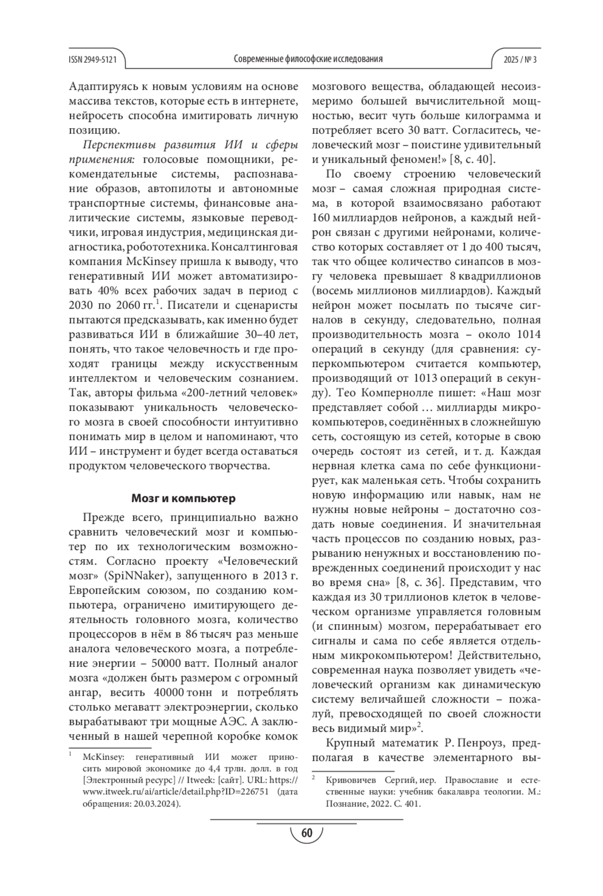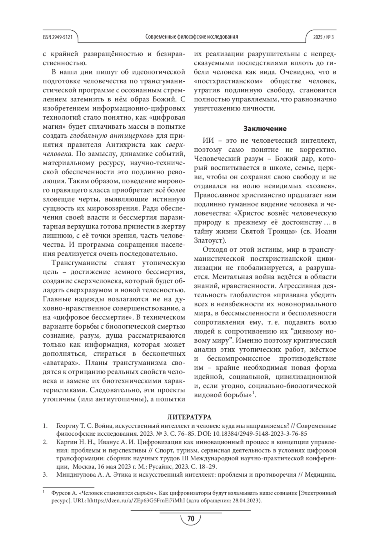 АЛЁХИНА Е. В., КАРГИН Н. Н. ИСКУССТВЕННЫЙ ИНТЕЛЛЕКТ И ЧЕЛОВЕЧЕСКИЙ РАЗУМ В ПЕРСПЕКТИВЕ ГЛОБАЛИЗАЦИИ // СОВРЕМЕННЫЕ ФИЛОСОФСКИЕ ИССЛЕДОВАНИЯ. 2025. № 3