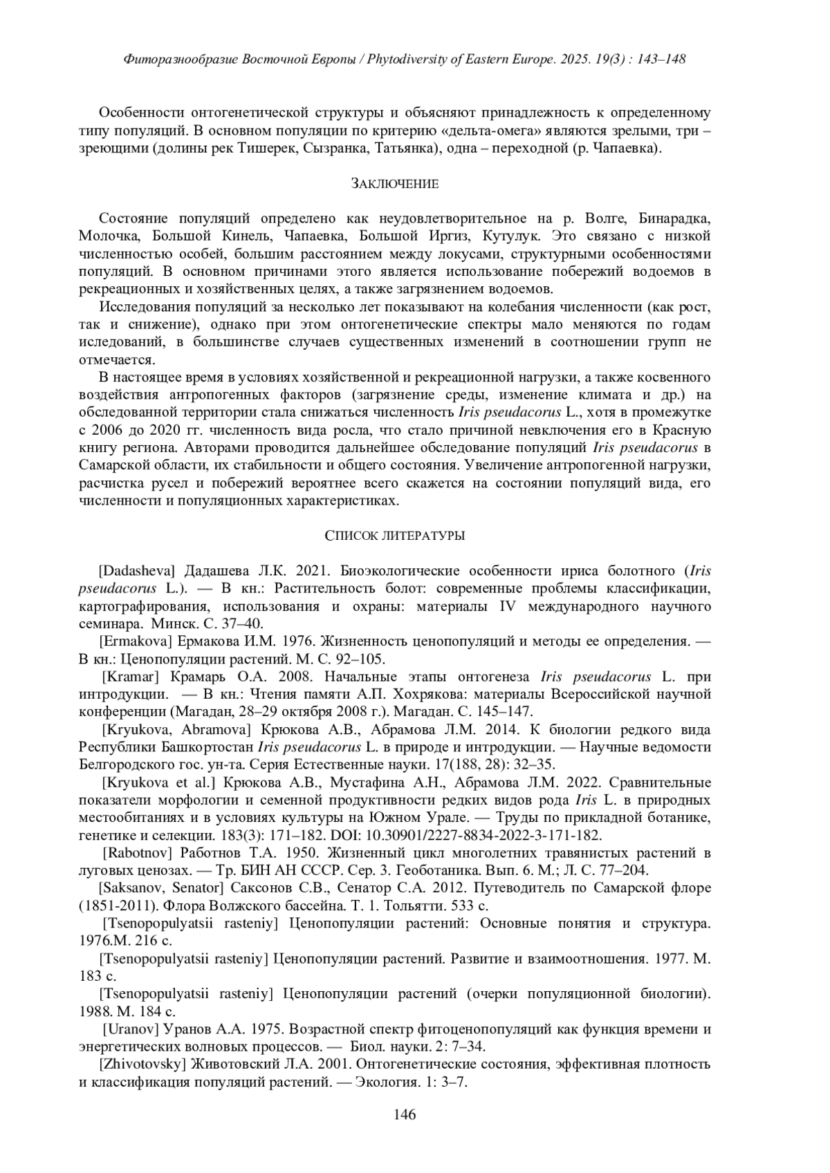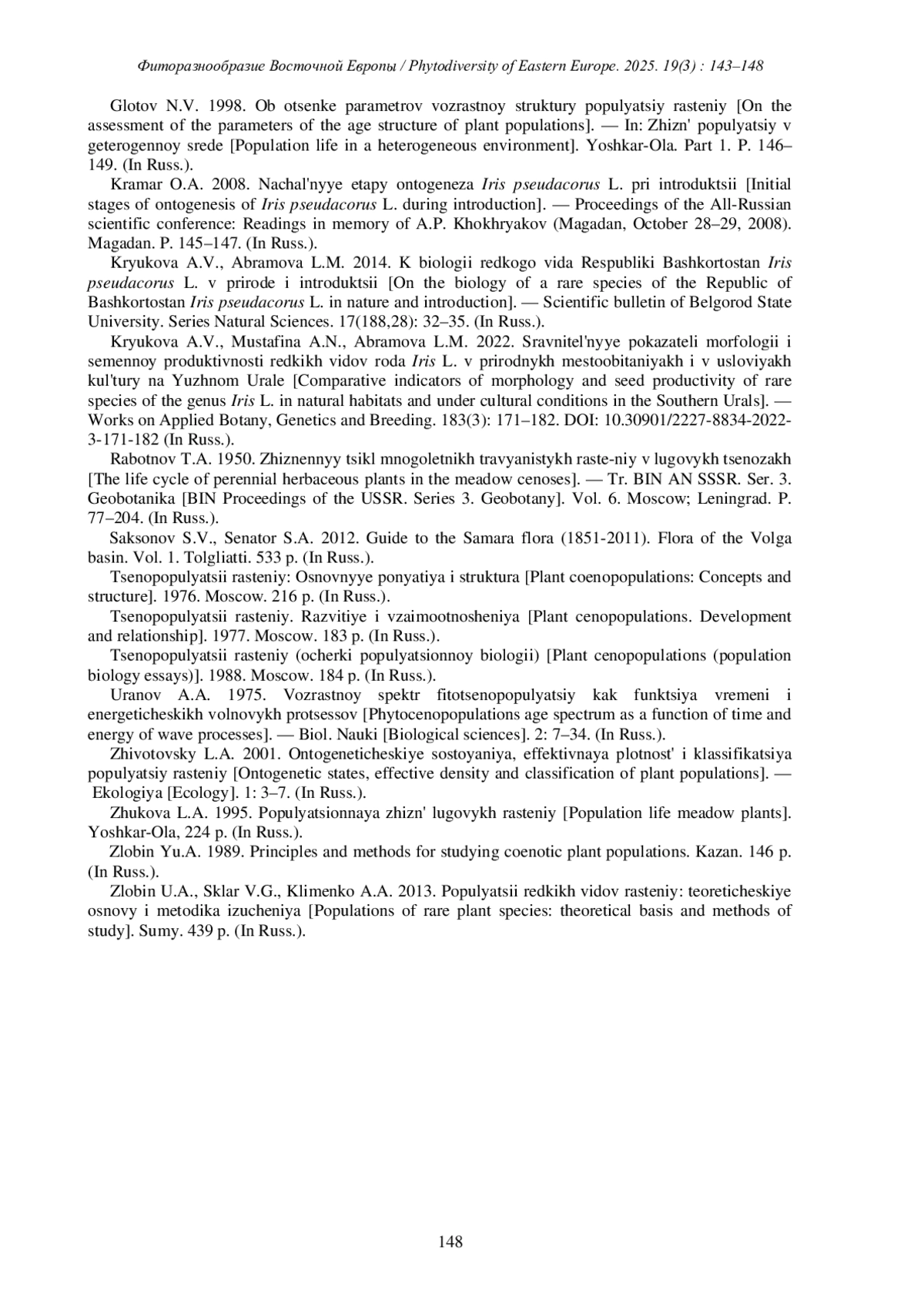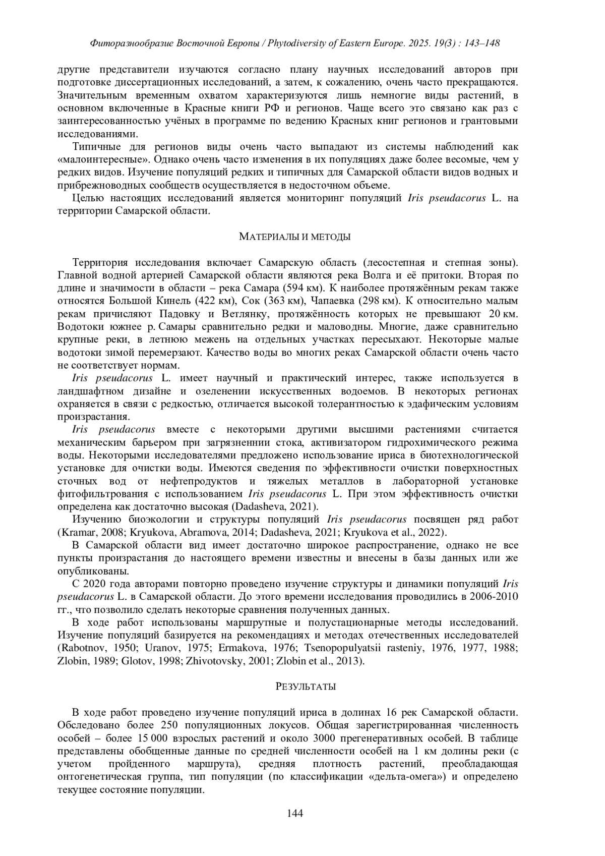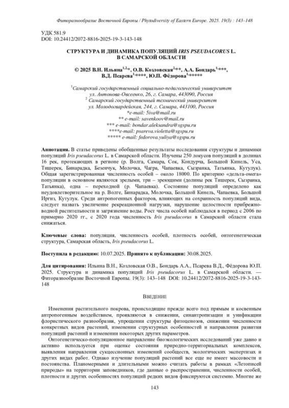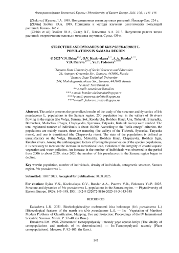 ИЛЬИНА В. Н., КОЗЛОВСКАЯ О. В., БОНДАРЬ А.А., ПСАРЕВА В.Д., ФЁДОРОВА Ю.П. СТРУКТУРА И ДИНАМИКА ПОПУЛЯЦИЙ IRISPSEUDACORUS L. В САМАРСКОЙ ОБЛАСТИ // ФИТОРАЗНООБРАЗИЕ ВОСТОЧНОЙ ЕВРОПЫ. 2025. Т. 19 № 3