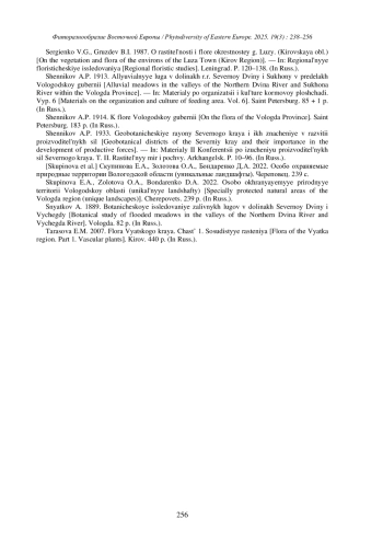 32. [Sergienko] Сергиенко В.Г. 2014. Состав и структура локальных флор в восточной части Вологодской области. - Ботанический журнал. 99(4): 418-442. EDN: SABJAV