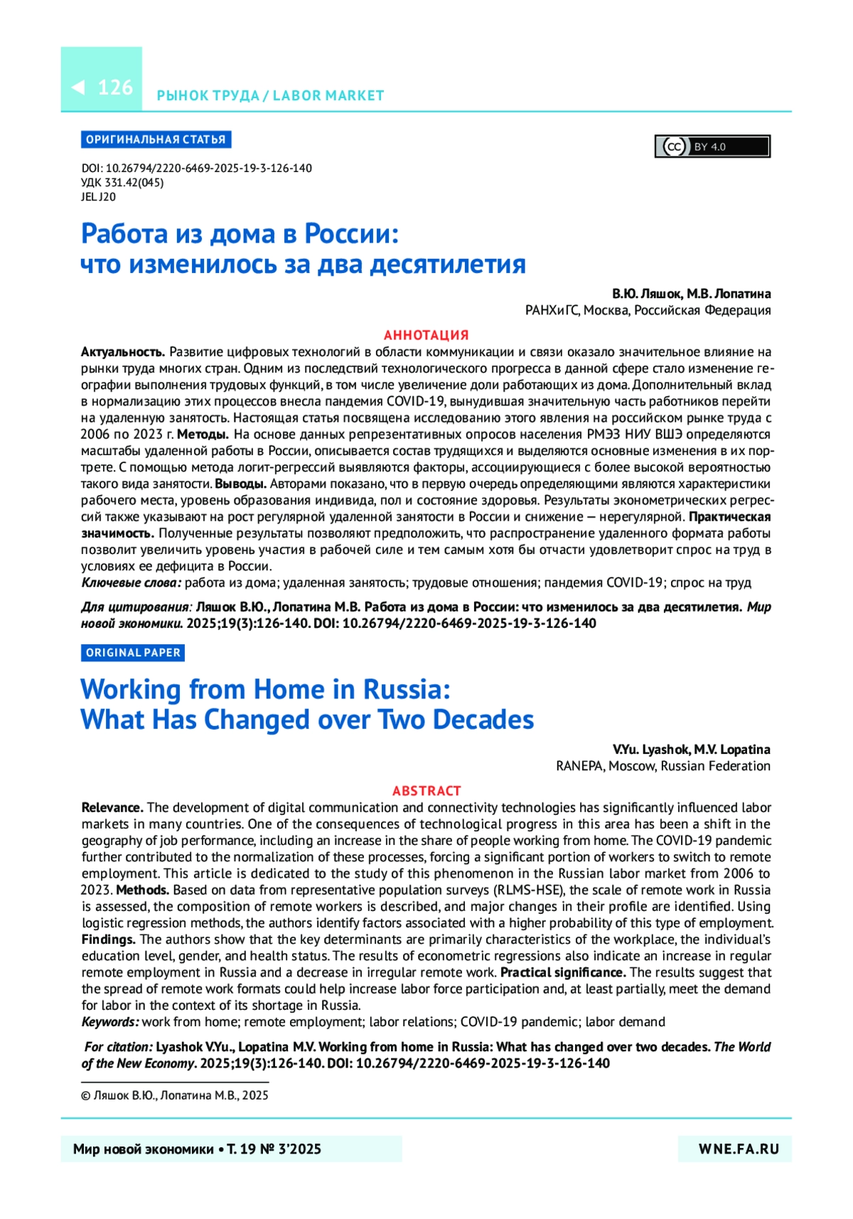 Выводы. Авторами показано, что в первую очередь определяющими являются характеристики рабочего места, уровень образования индивида, пол и состояние здоровья. Результаты эконометрических регрессий также указывают на рост регулярной удаленной занятости в России и снижение — нерегулярной. Практическая значимость. Полученные результаты позволяют предположить, что распространение удаленного формата работы позволит увеличить уровень участия в рабочей силе и тем самым хотя бы отчасти удовлетворит спрос на труд в условиях ее дефицита в России.