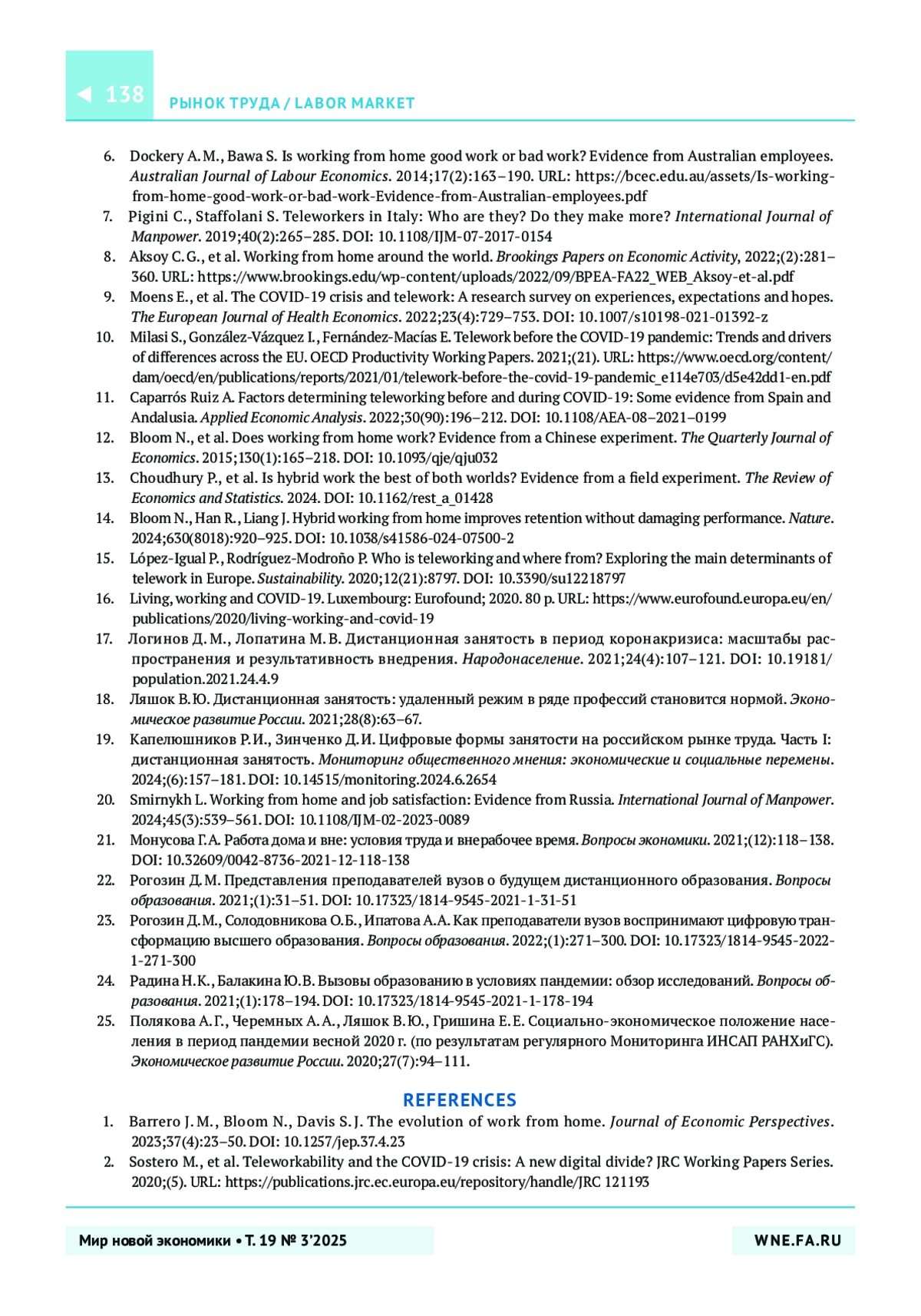 19. Капелюшников Р.И., Зинченко Д.И. Цифровые формы занятости на российском рынке труда. Часть I: дистанционная занятость. Мониторинг общественного мнения: экономические и социальные перемены. 2024;(6):157-181. https://doi.org/10.14515/monitoring.2024.6.2654