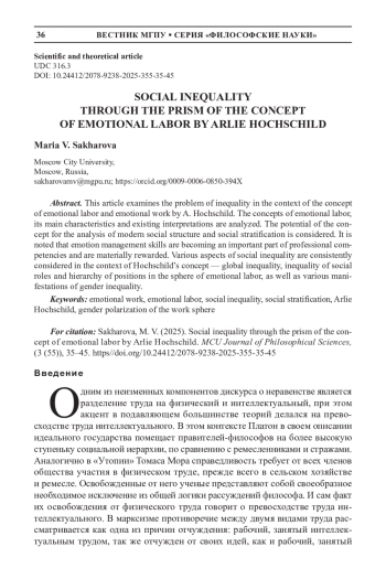 В статье рассматривается проблема неравенства в контексте концепции эмоционального труда и эмоциональной работы А. Хокшилд. Анализируется понятие эмоционального труда, основные его характеристики и существующие трактовки. Рассматривается потенциал концепции для анализа современной социальной структуры и социальной стратификации. Отмечается, что навыки управления эмоциями становятся важной частью профессиональных компетенций и материально вознаграждаются. Последовательно рассматриваются различные аспекты социального неравенства через призму концепции Хокшилд - глобальное неравенство, неравенство социальных ролей и иерархия позиции в сфере эмоционального труда, а также различные проявления гендерного неравенства.