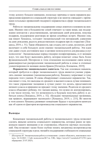 9. Симонова О. А. “Светлые” и “темные” стороны эмоционального труда: концепция отчуждения в теории А. Р. Хокшилд и современные исследования // Журнал социологии и социальной антропологии. 2023. Т. 26. № 1. С. 88-117. DOI: 10.31119/jssa.2023.26.1.4 EDN: JUEVKJ