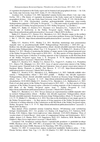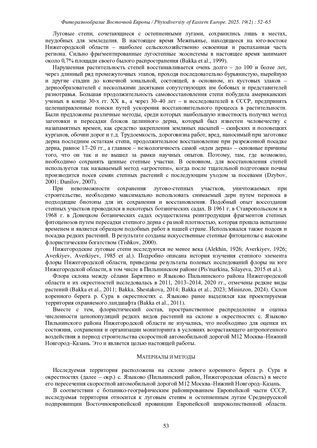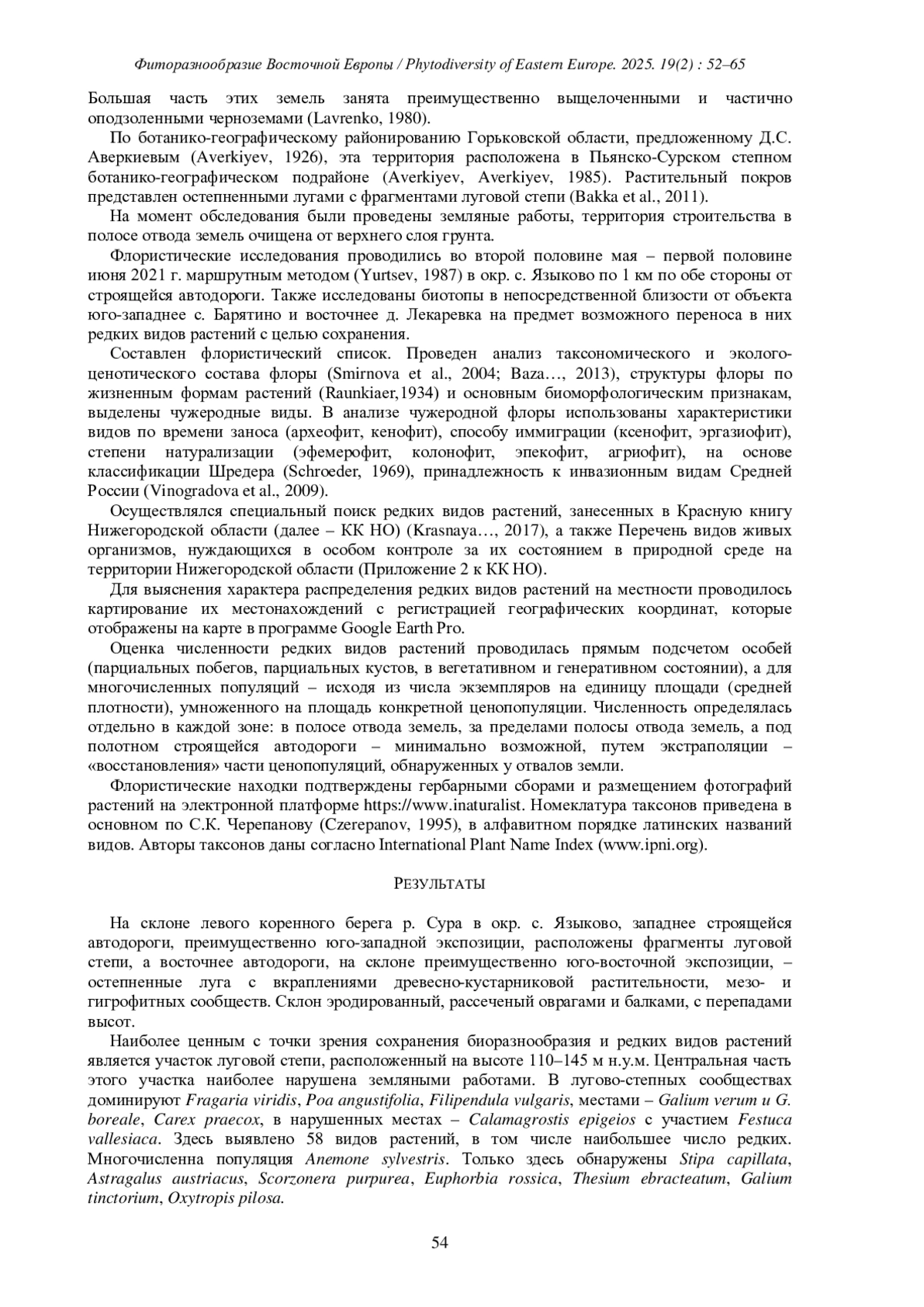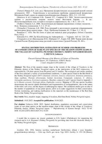 ГАФУРОВА М.М. ПРОСТРАНСТВЕННОЕ РАСПРЕДЕЛЕНИЕ, ОЦЕНКА ЧИСЛЕННОСТИ И ПРОБЛЕМЫ СОХРАНЕНИЯ РЕДКИХ ВИДОВ РАСТЕНИЙ ЛУГОСТЕПНОГО СКЛОНА В ОКРЕСТНОСТЯХ СЕЛА ЯЗЫКОВО ПИЛЬНИНСКОГО РАЙОНА НИЖЕГОРОДСКОЙ ОБЛАСТИ // ФИТОРАЗНООБРАЗИЕ ВОСТОЧНОЙ ЕВРОПЫ. 2025. Т. 19 № 2