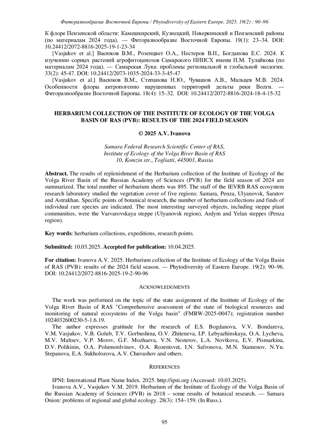 ИВАНОВА А.В. ГЕРБАРНАЯ КОЛЛЕКЦИЯ ИНСТИТУТА ЭКОЛОГИИ ВОЛЖСКОГО БАССЕЙНА РАН (PVB): ИТОГИ ПОЛЕВОГО СЕЗОНА 2024 ГОДА // ФИТОРАЗНООБРАЗИЕ ВОСТОЧНОЙ ЕВРОПЫ. 2025. Т. 19 № 2